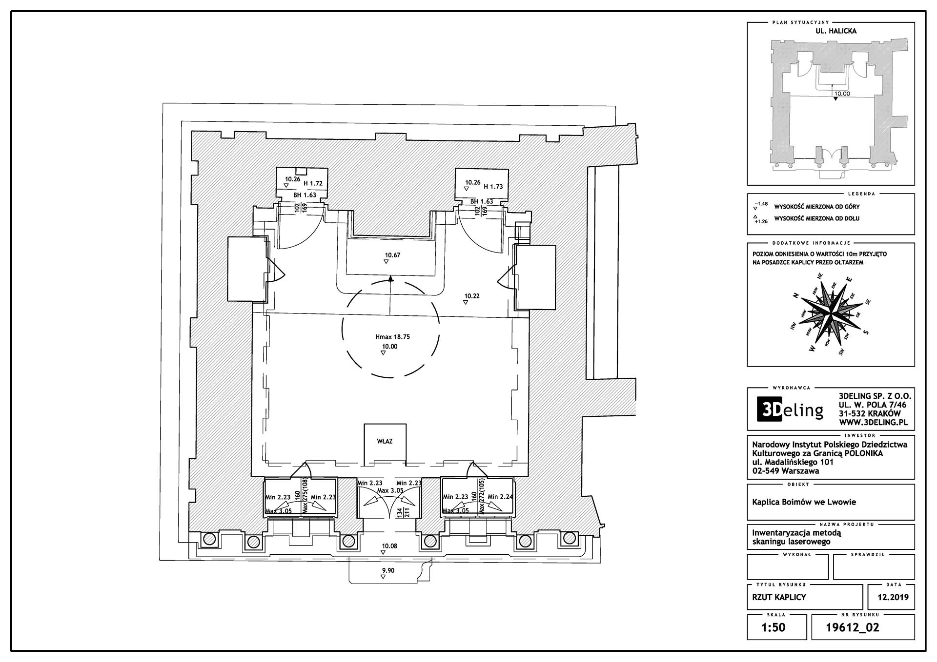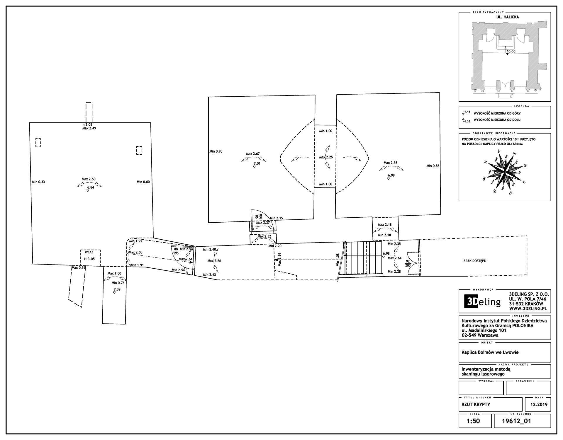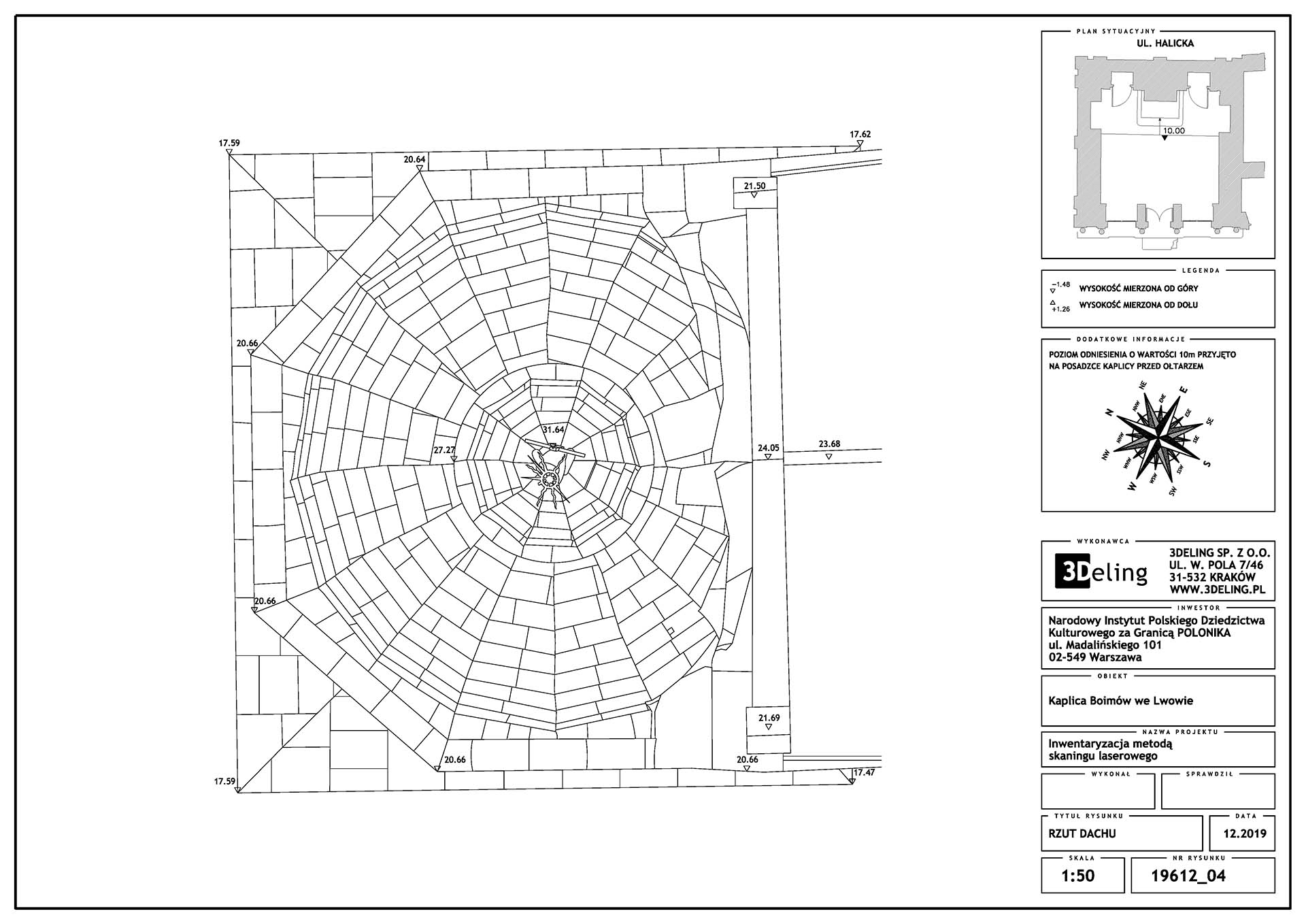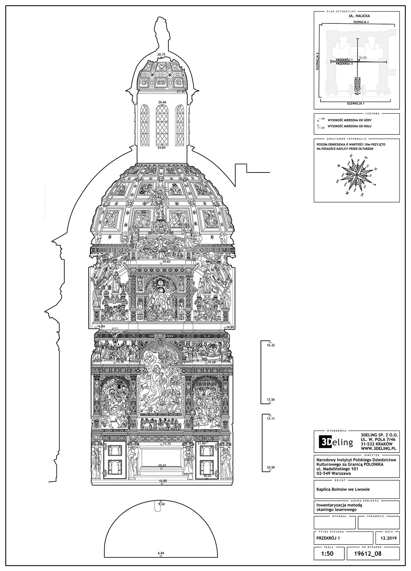 During the survey, beside the regular laser scanning, we used drone and camera set on a pole. Additionally we mounted a special scaffolding inside the Chapel, to capture all details of its interior. This way we managed to obtain precise laser scanning and photographic data. Later on we processed those input data, which resulted in generating photogrammetric documentation of the Chapel as well as detailed 2D CAD documentation and high-poly 3D mesh model.