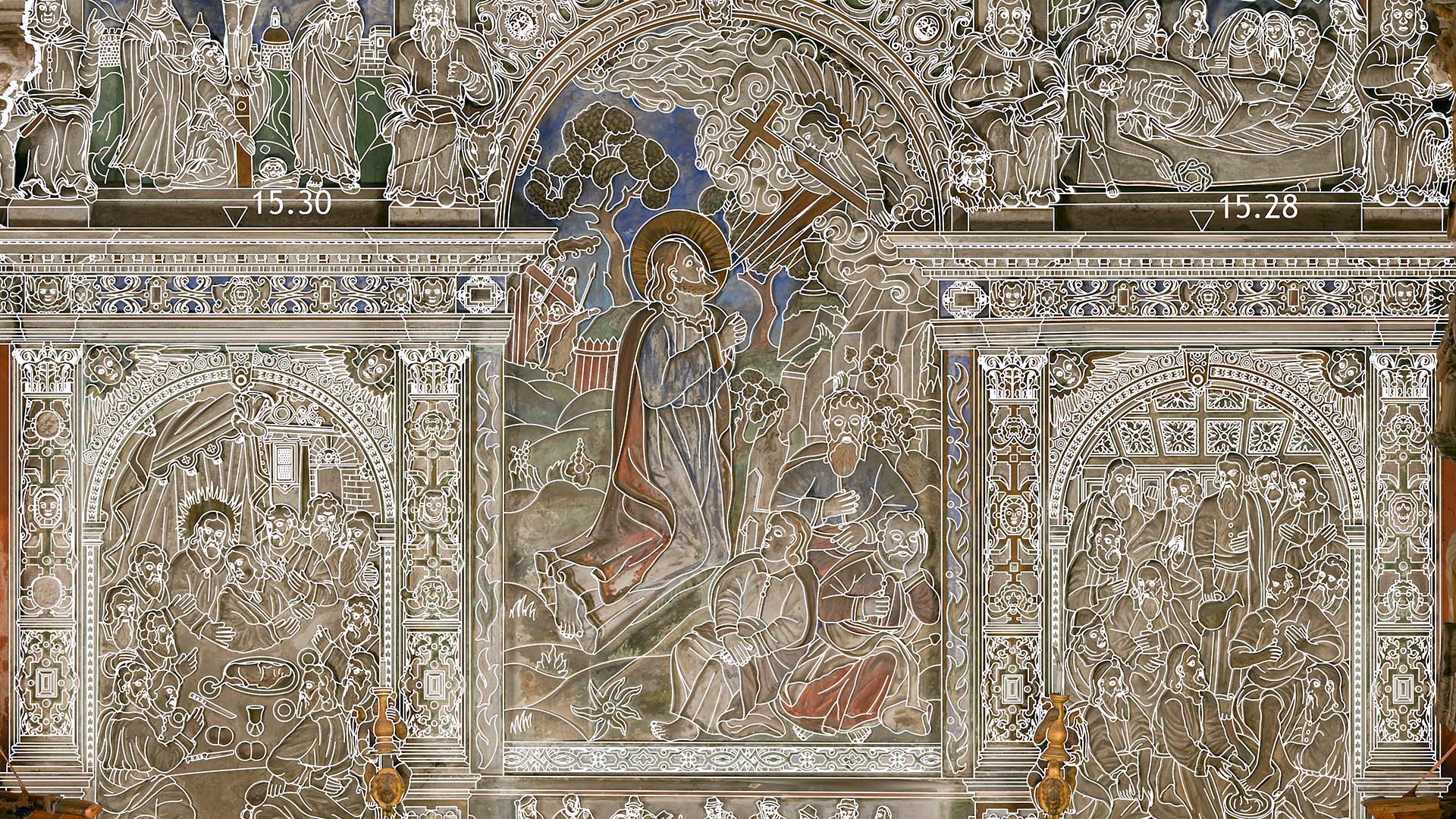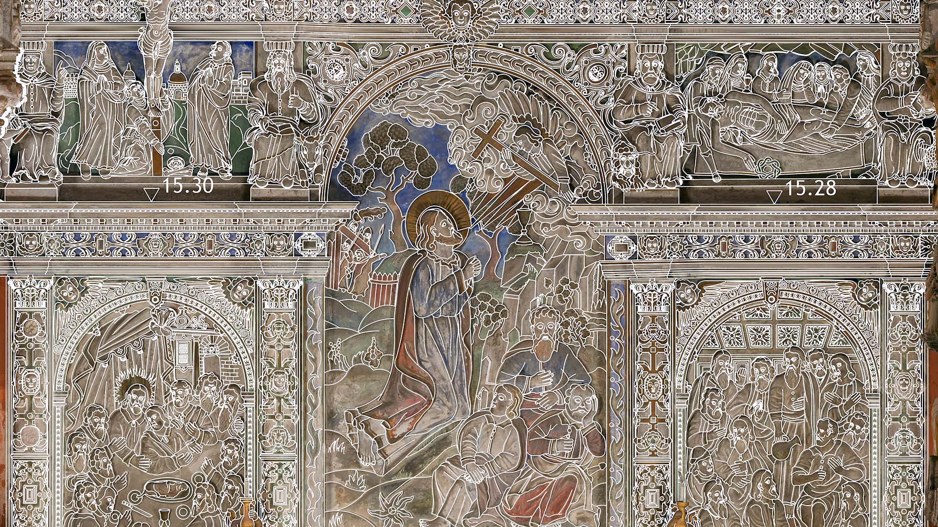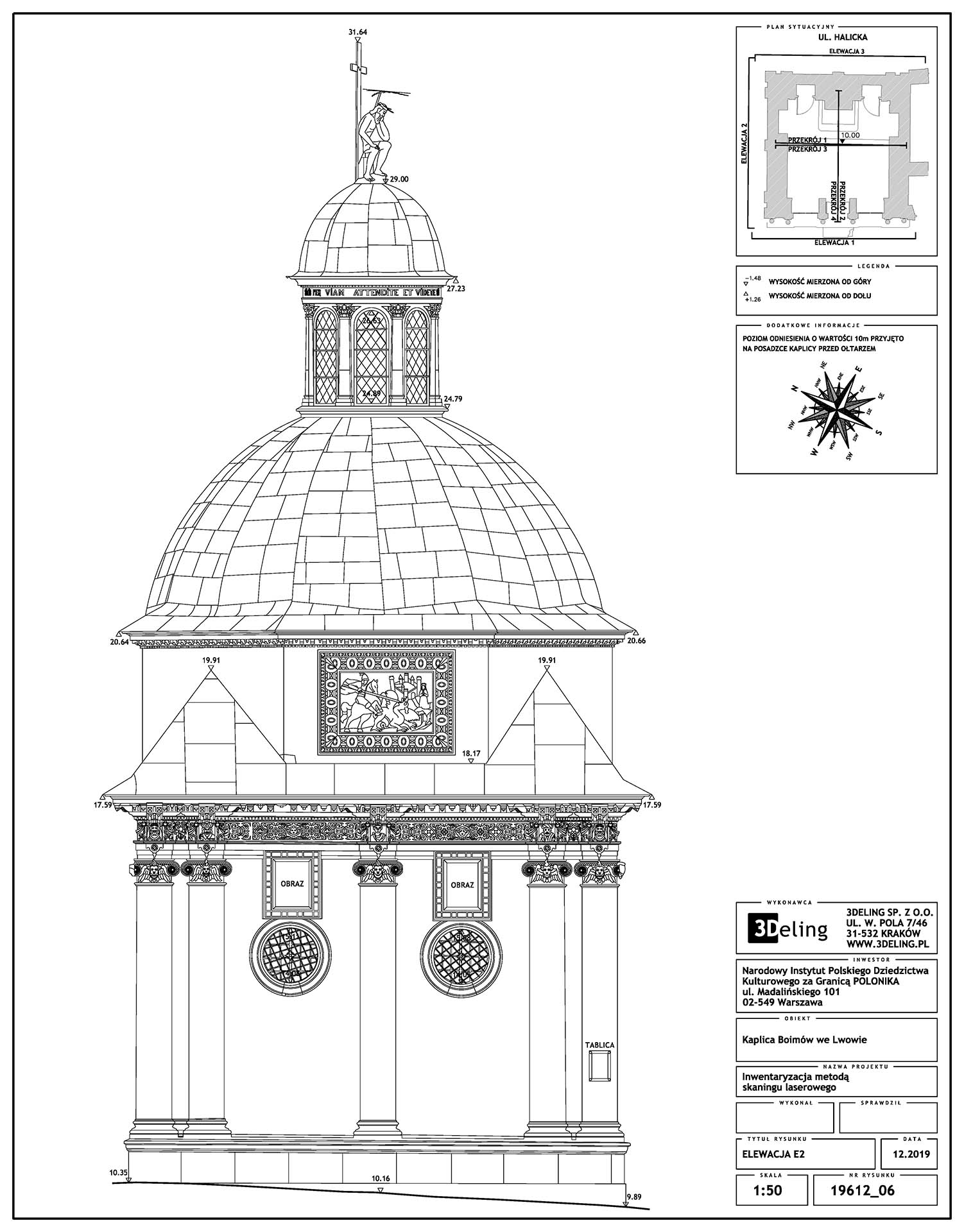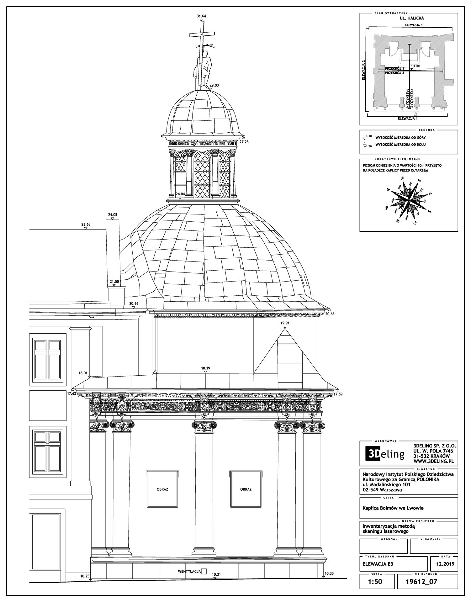 During the survey, beside the regular laser scanning, we used drone and camera set on a pole. Additionally we mounted a special scaffolding inside the Chapel, to capture all details of its interior. This way we managed to obtain precise laser scanning and photographic data. Later on we processed those input data, which resulted in generating photogrammetric documentation of the Chapel as well as detailed 2D CAD documentation and high-poly 3D mesh model.