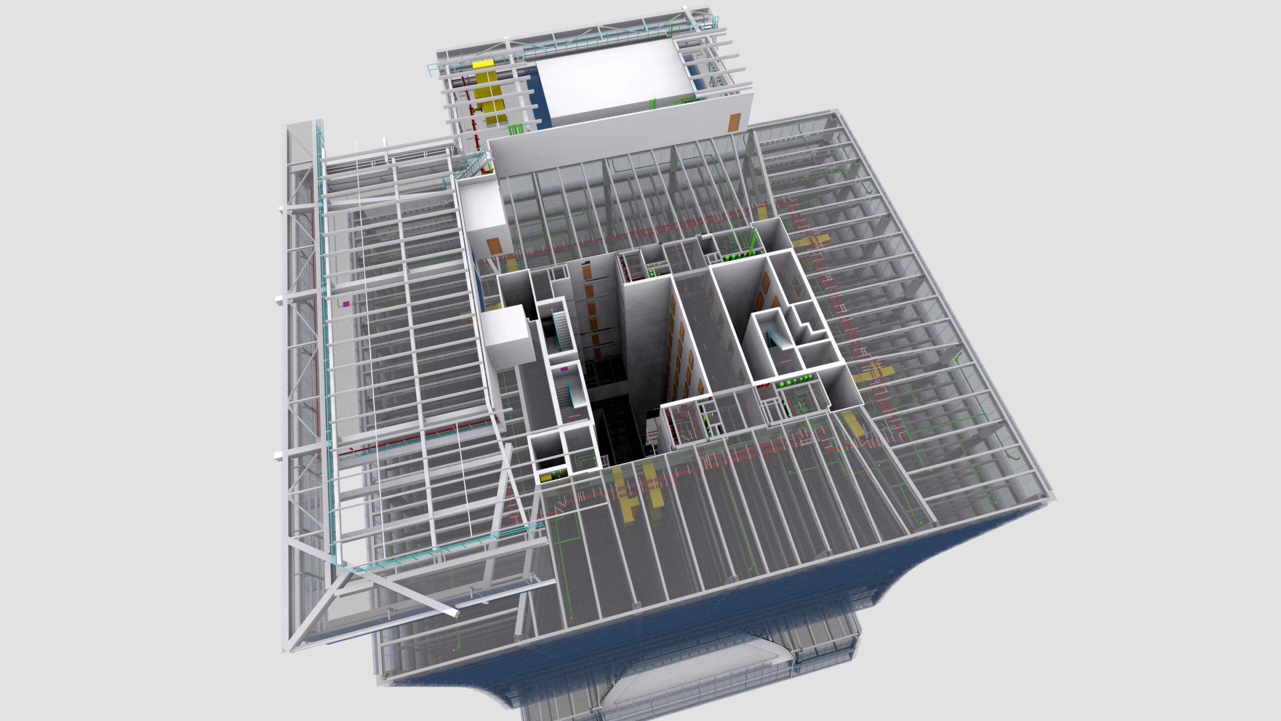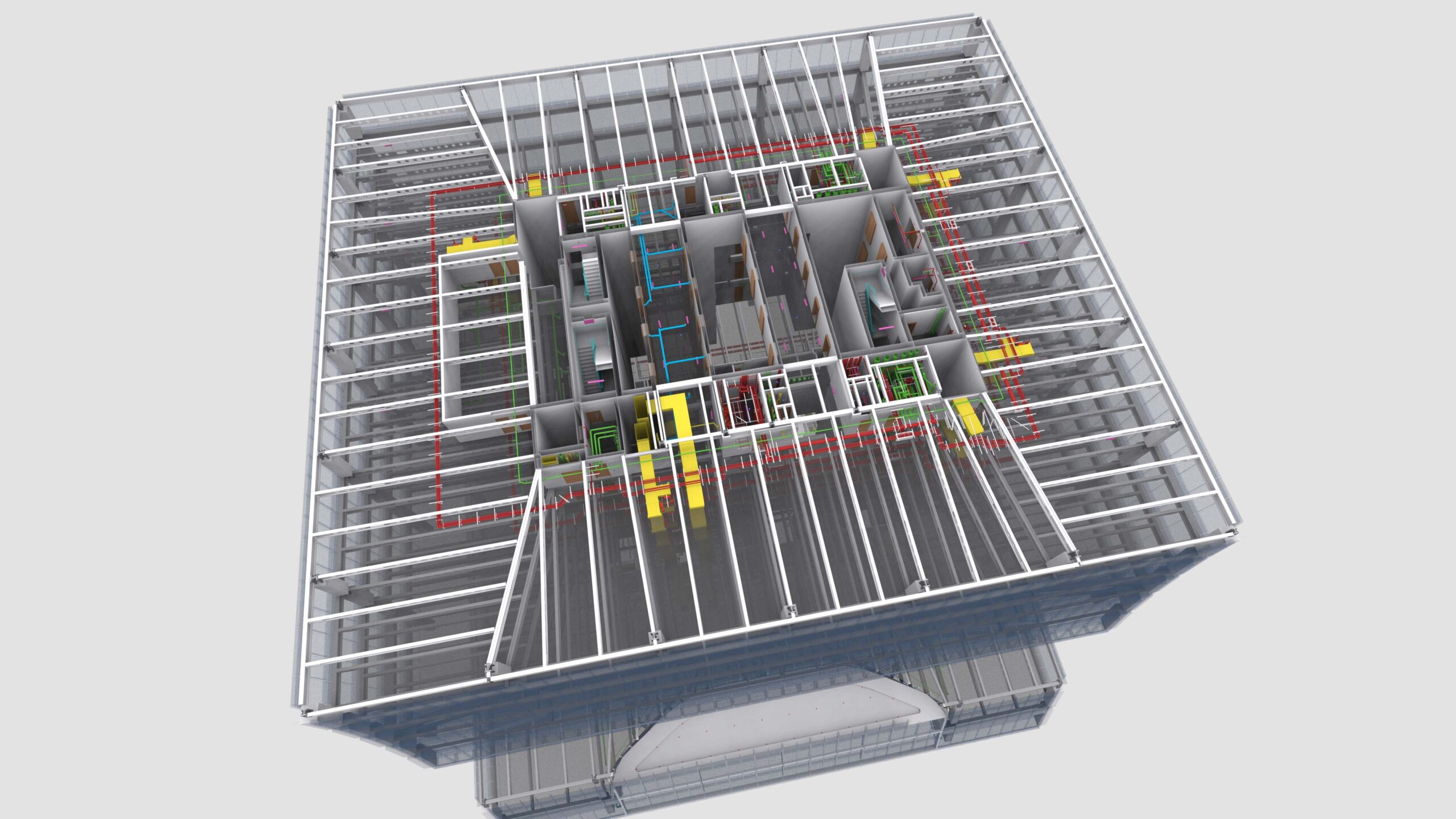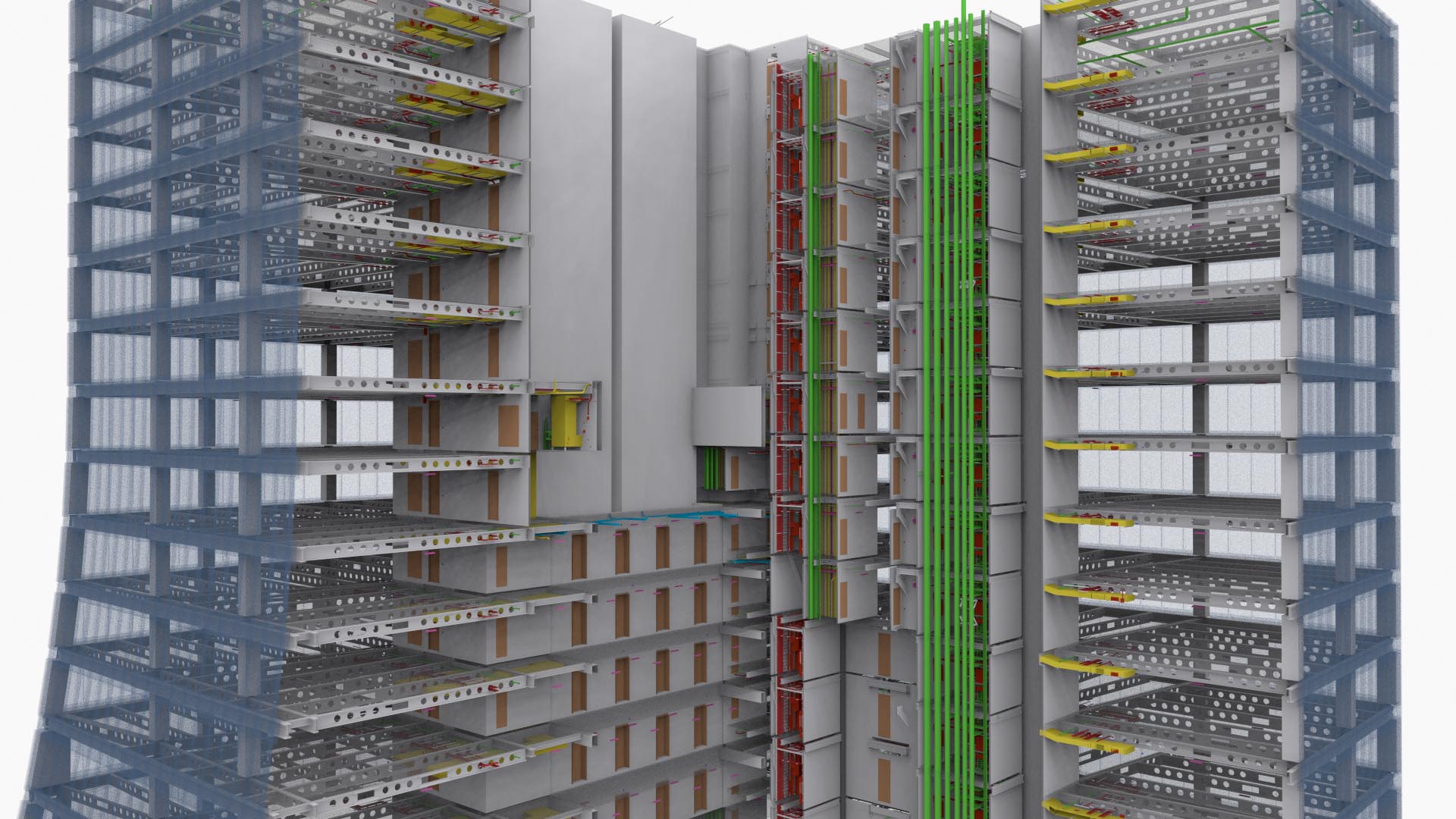 The scope of the project included 3D laser scanning and 3D BIM modelling of a new-build office building. A client decided to as-built only 15 last floors of the building, roof and basement areas, all staircases and outside. Even with this limitation of the scope the project turn out to be quite large: we positioned about 1500 single scans, registered with support of the independent control points. The whole task was challenging mainly due to the height of the building.