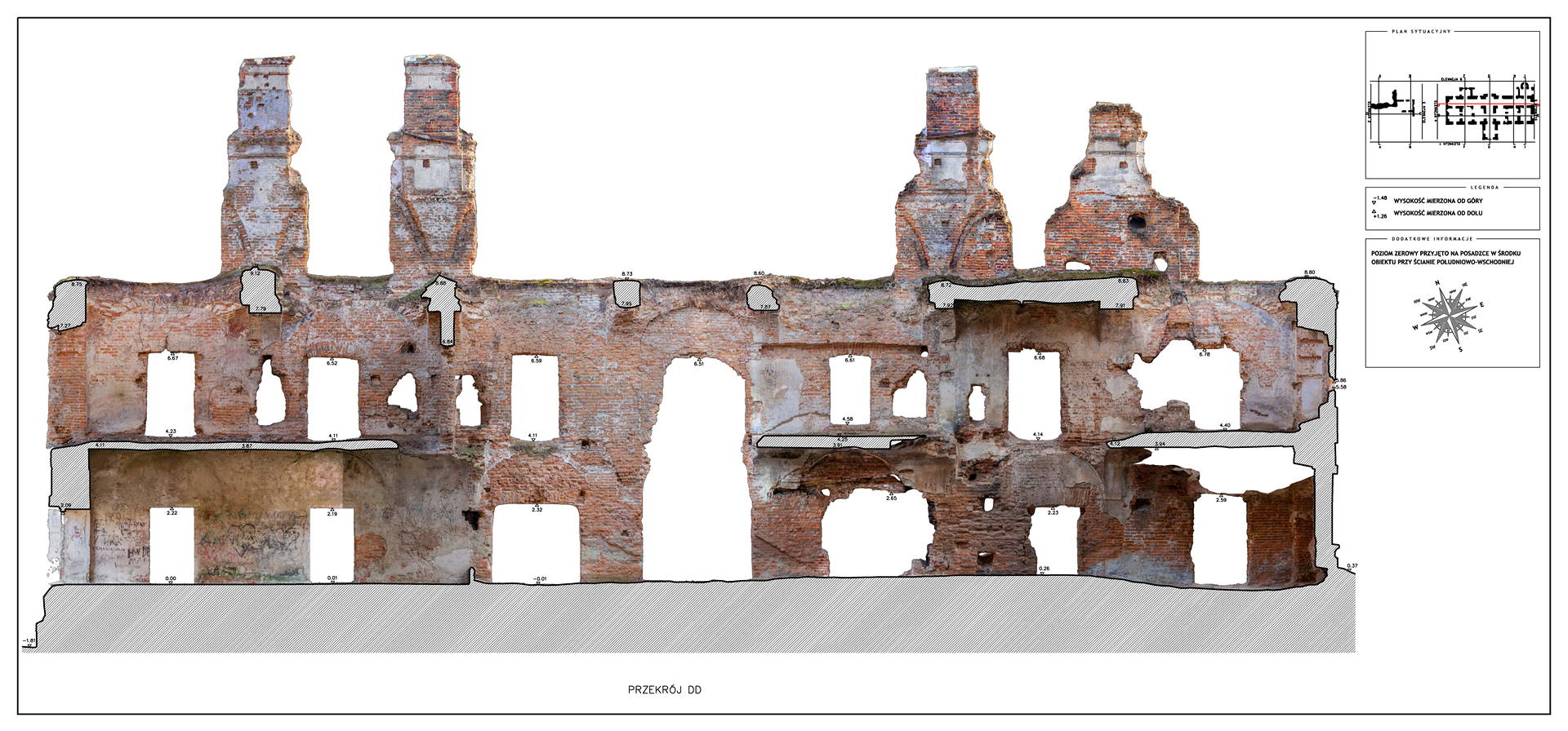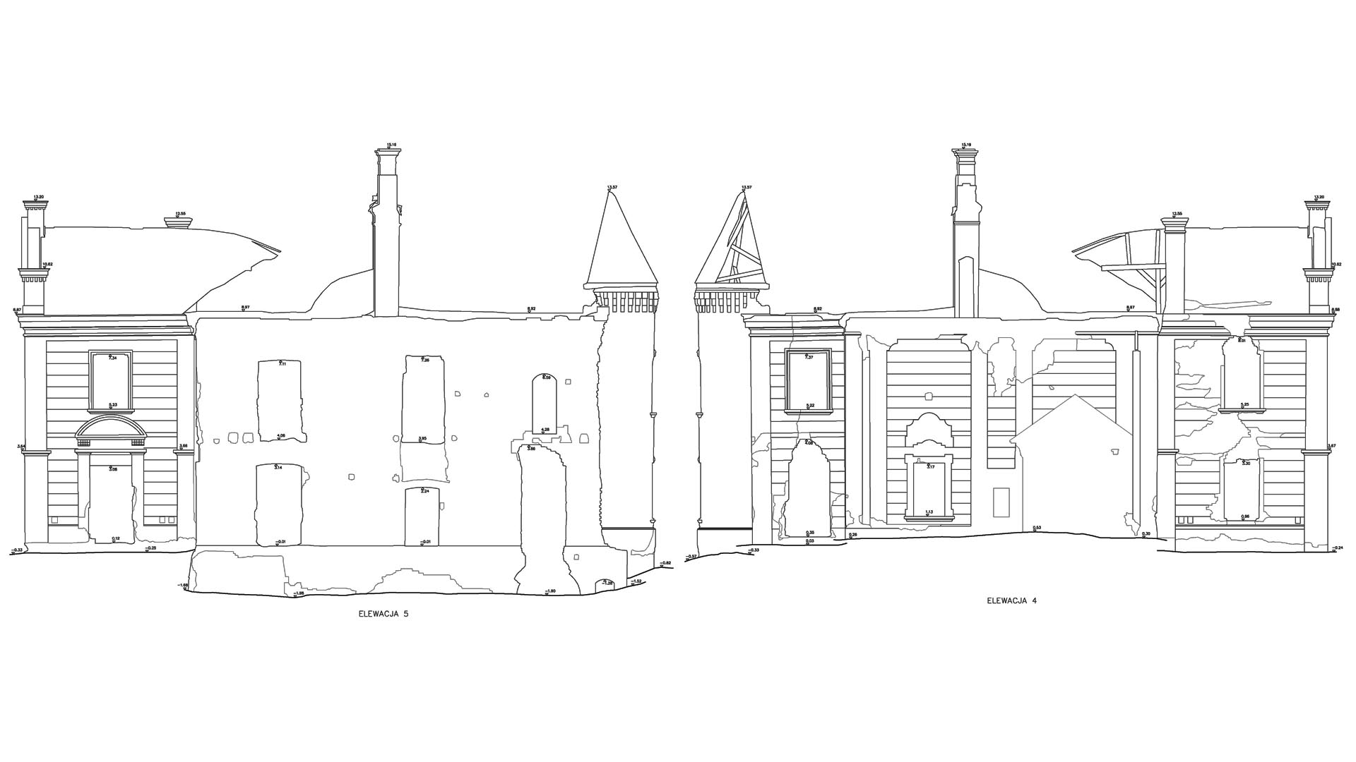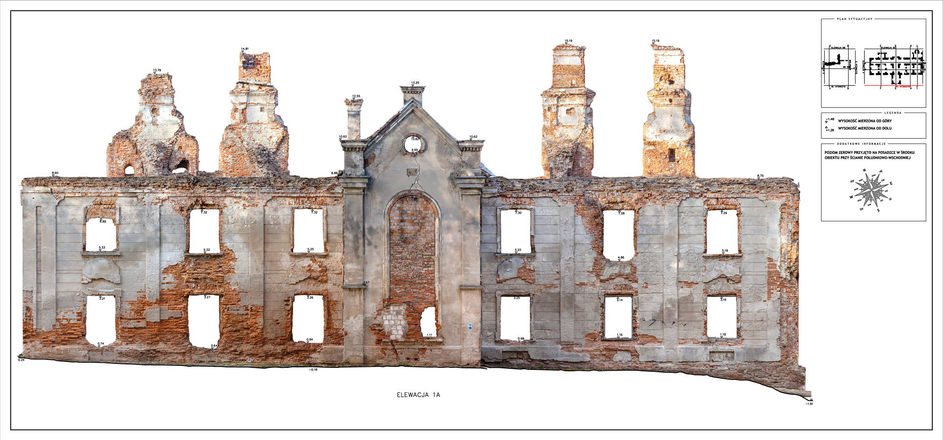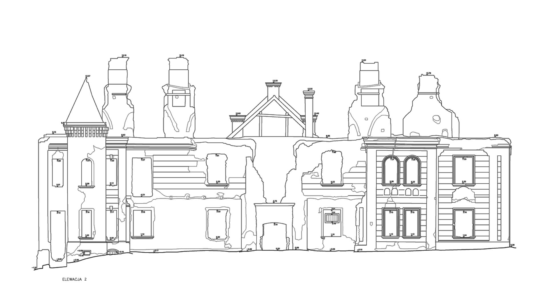 Located in South Eastern Poland in the town of Łaszczow, the current owner is planning to restore the ruins of this 16th Century Mansion House. Due to strict National Heritage regulations, the architect in charge commissioned an extensive survey to comprehensively record the remains of the existing structure. Orthoimages were produced to detail the position and condition of all the bricks within the remaining structure.