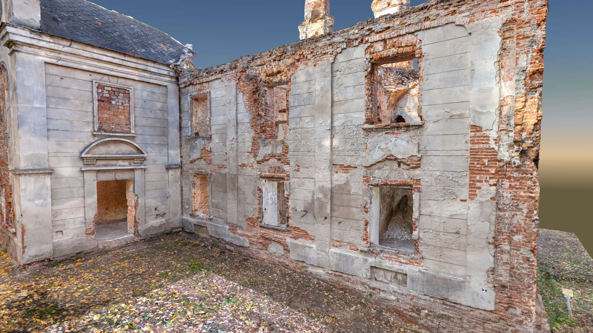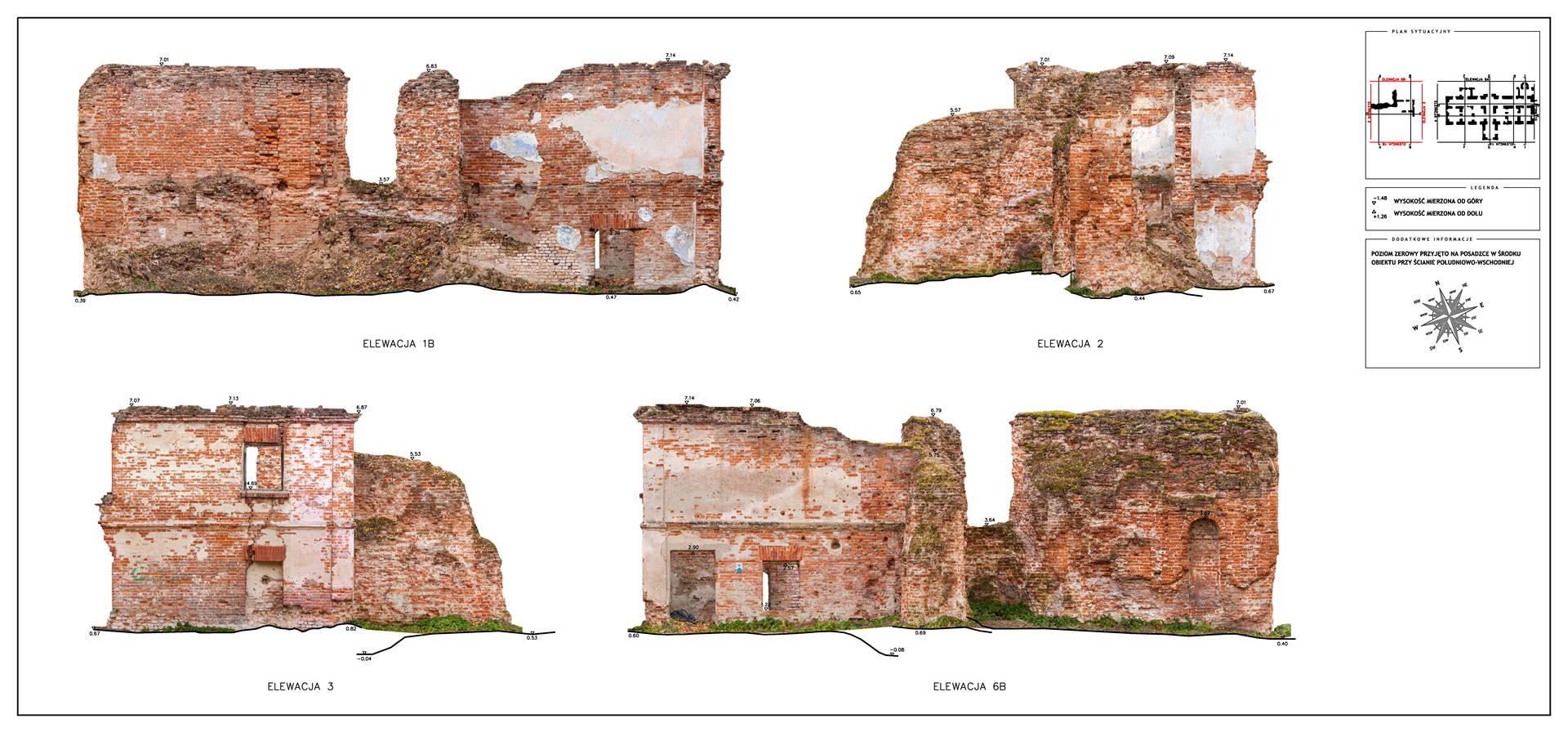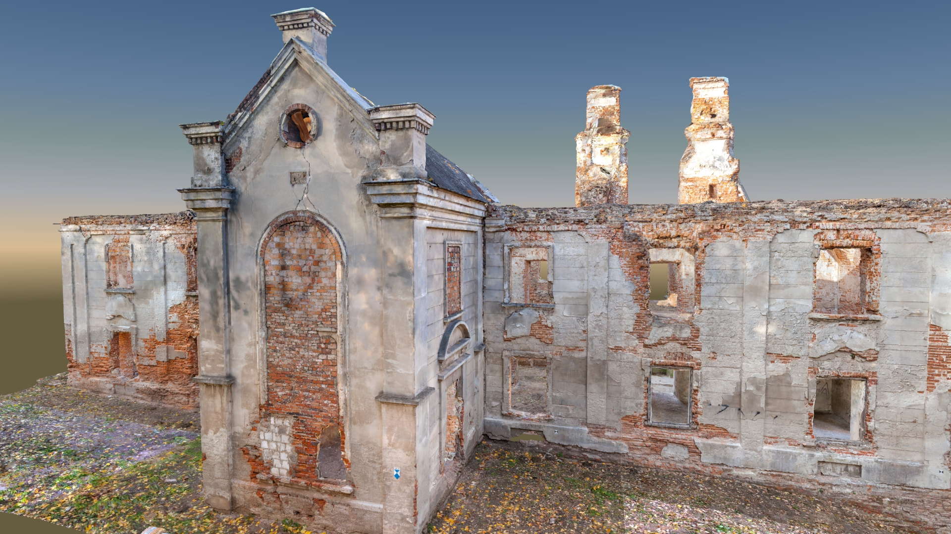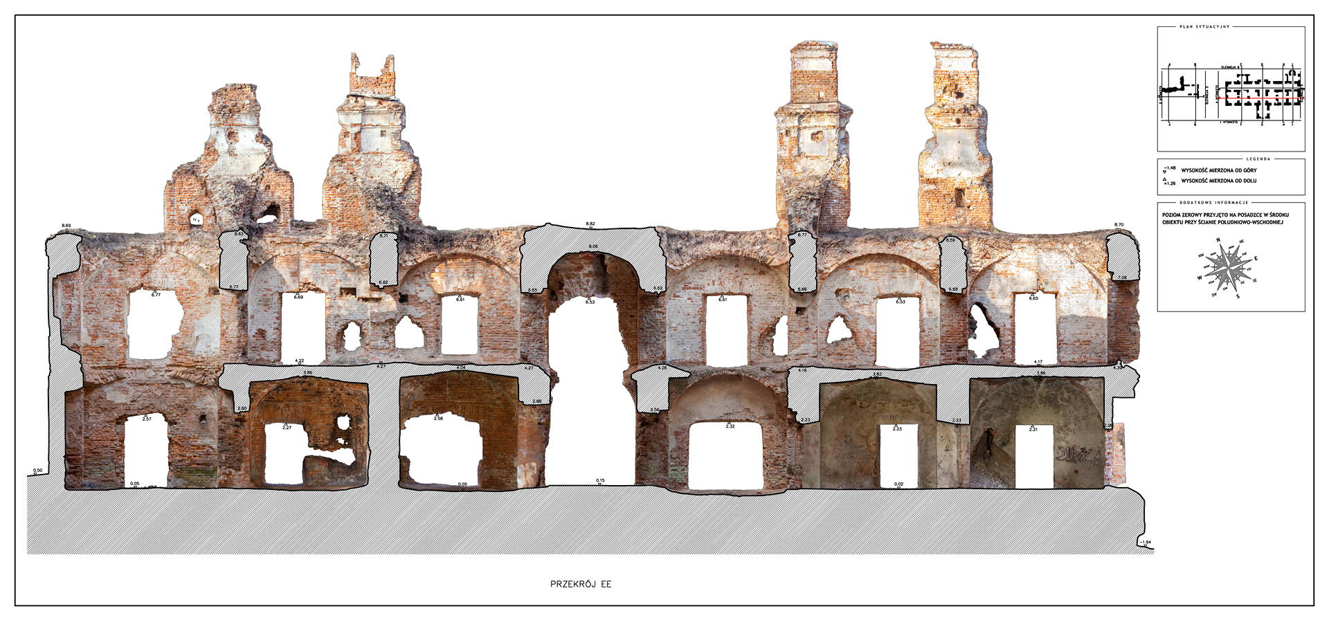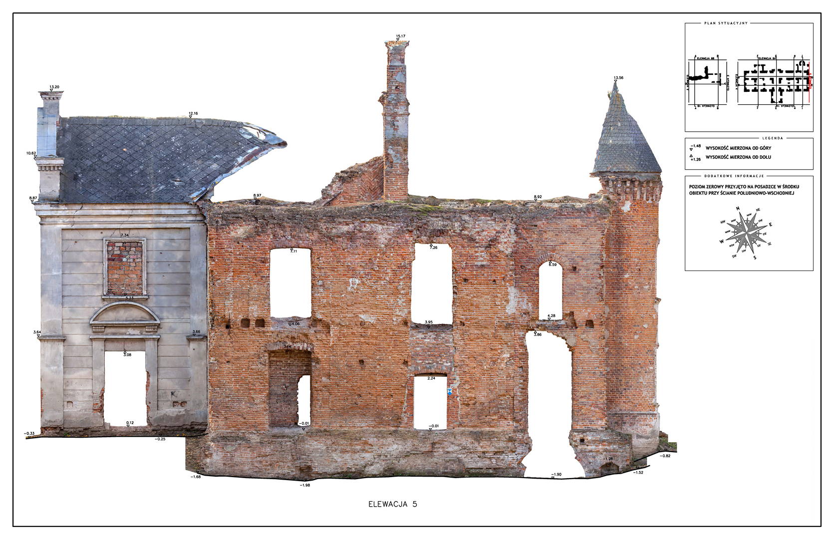 Located in South Eastern Poland in the town of Łaszczow, the current owner is planning to restore the ruins of this 16th Century Mansion House. Due to strict National Heritage regulations, the architect in charge commissioned an extensive survey to comprehensively record the remains of the existing structure. Orthoimages were produced to detail the position and condition of all the bricks within the remaining structure.