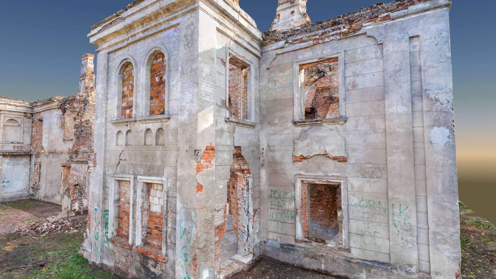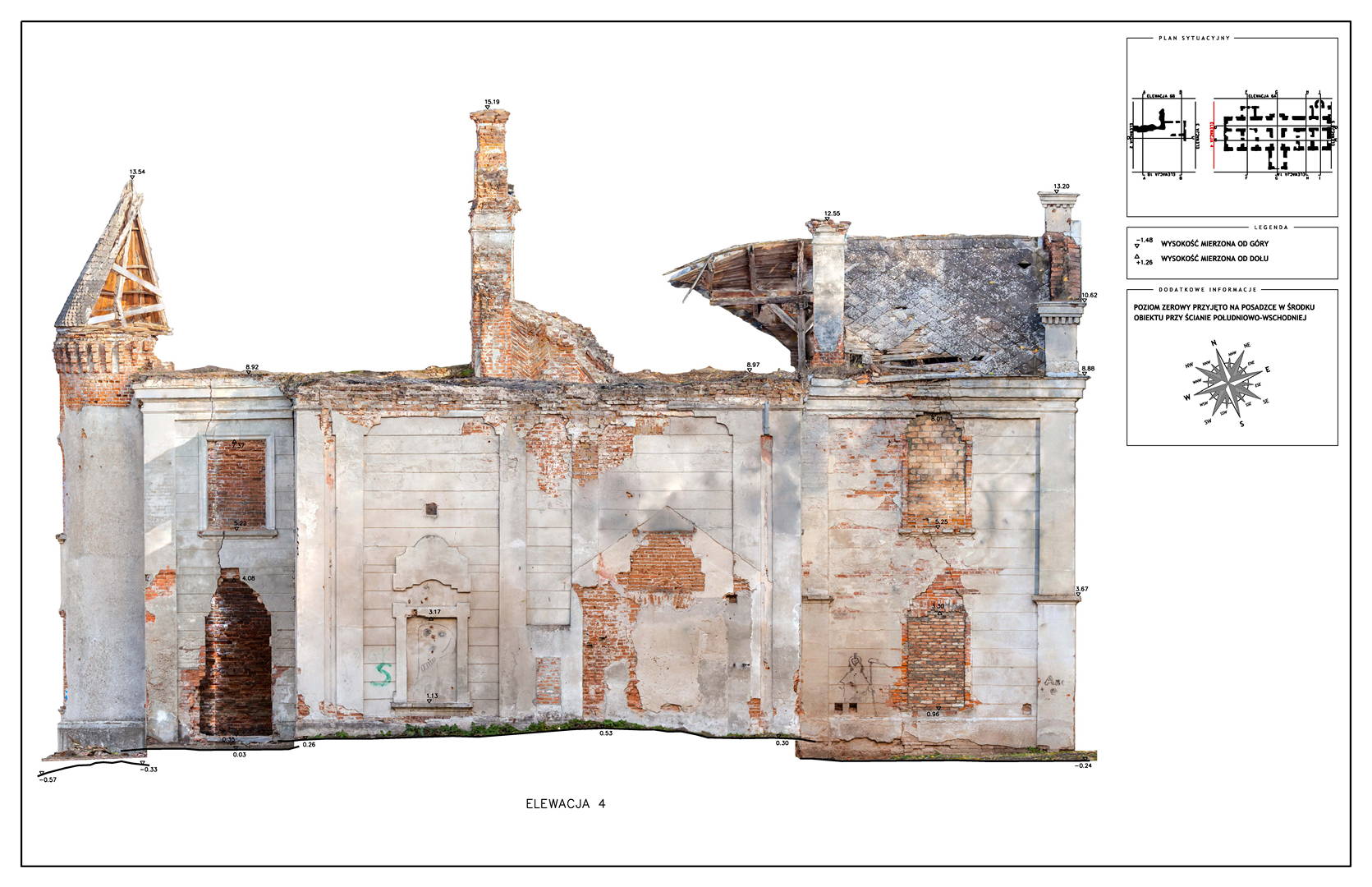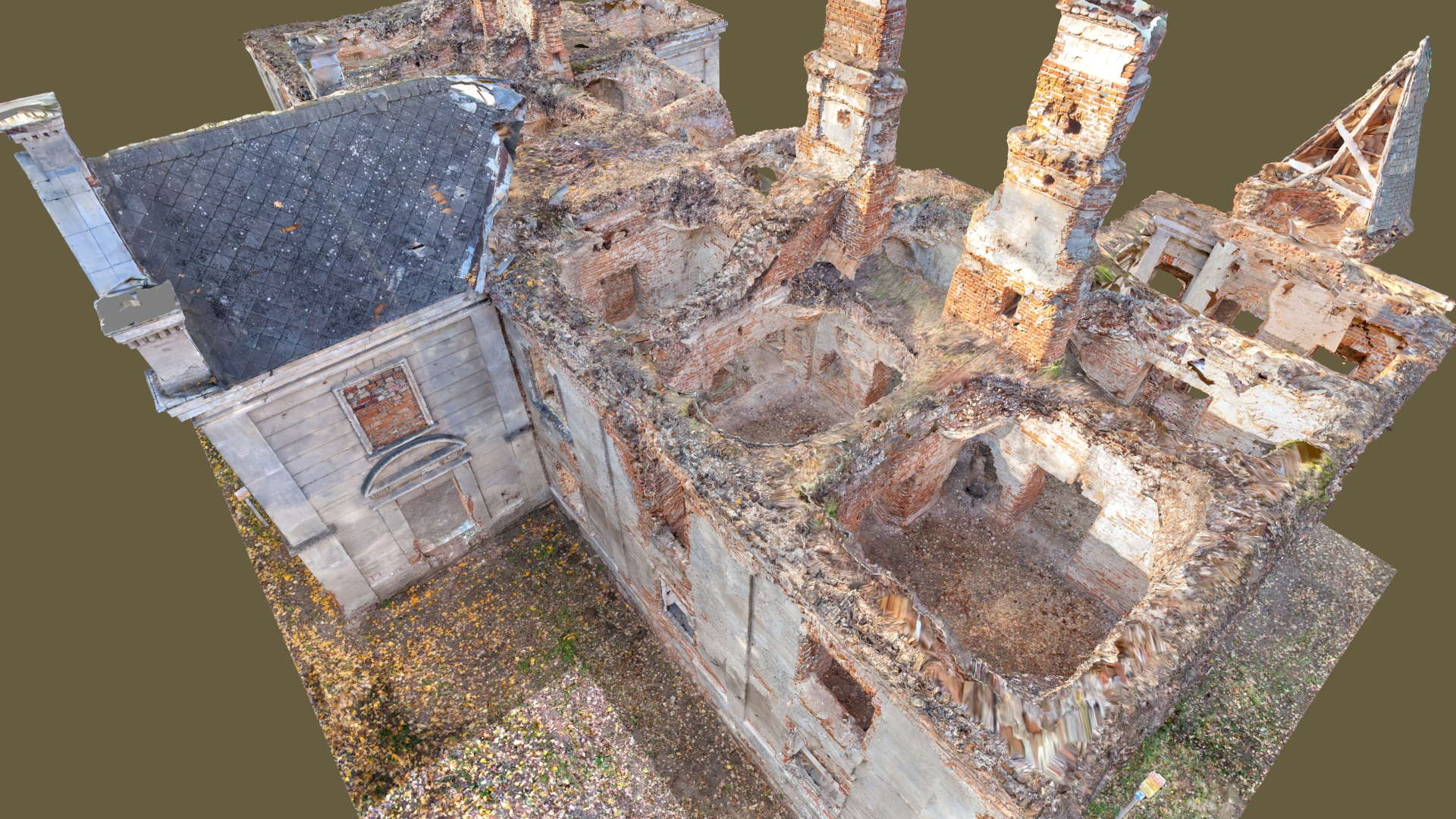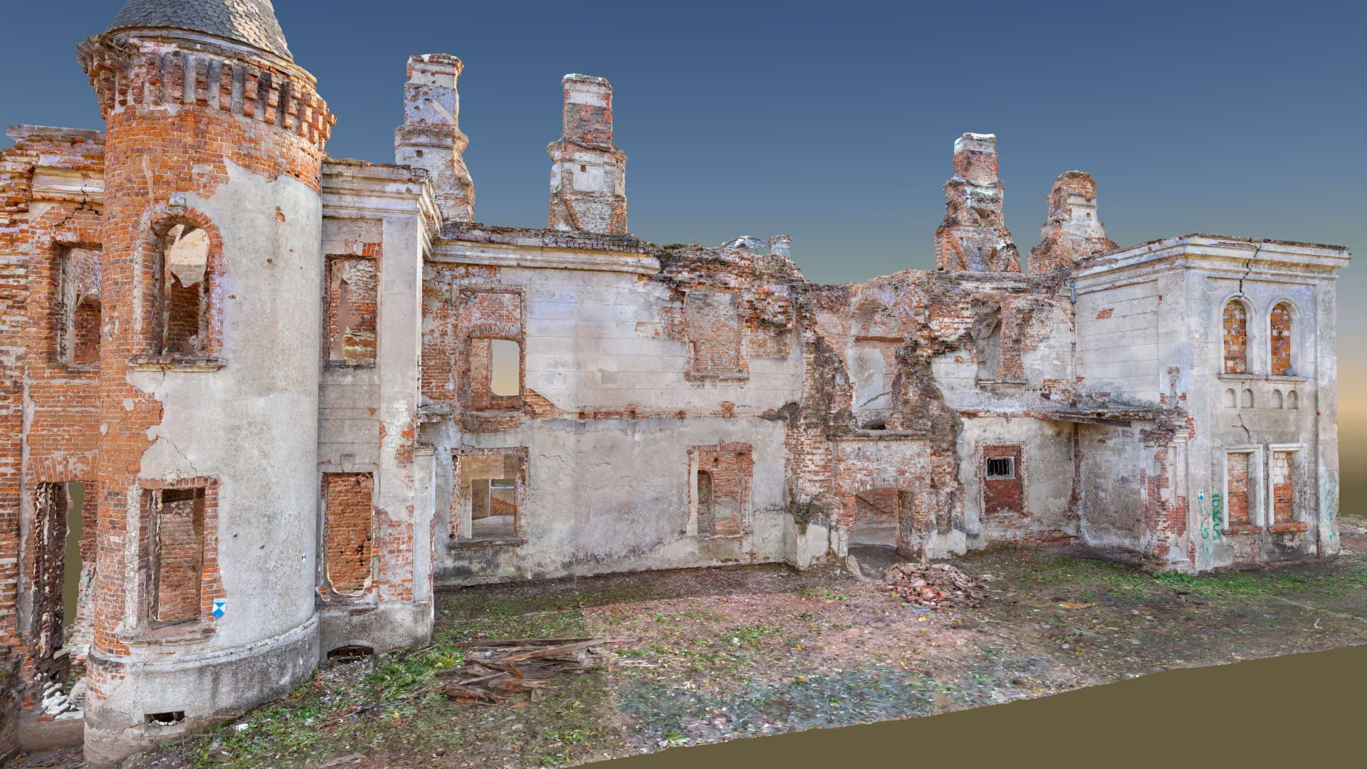 Located in South Eastern Poland in the town of Łaszczow, the current owner is planning to restore the ruins of this 16th Century Mansion House. Due to strict National Heritage regulations, the architect in charge commissioned an extensive survey to comprehensively record the remains of the existing structure. Orthoimages were produced to detail the position and condition of all the bricks within the remaining structure.