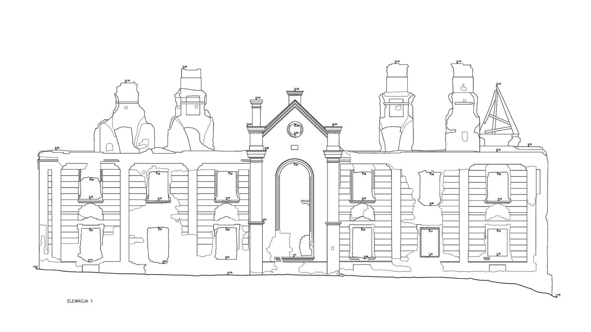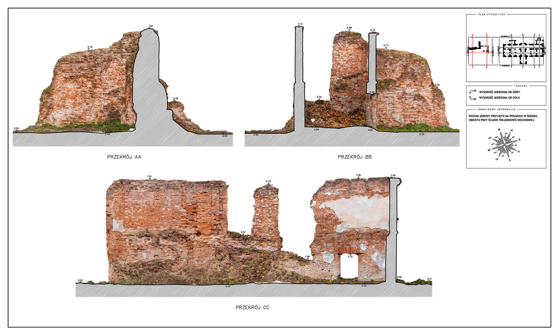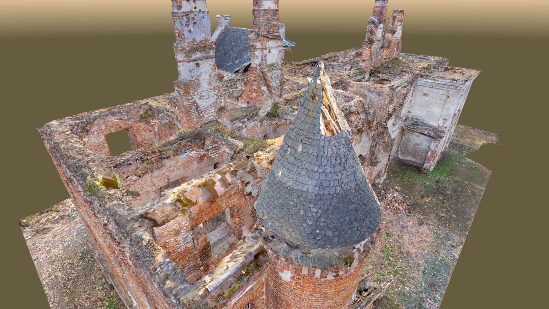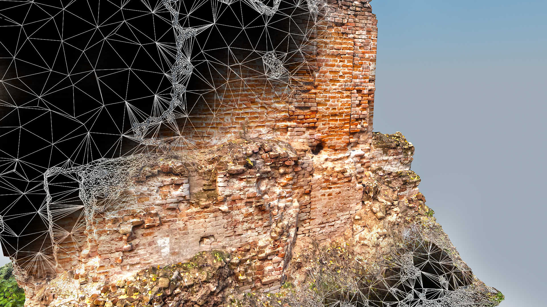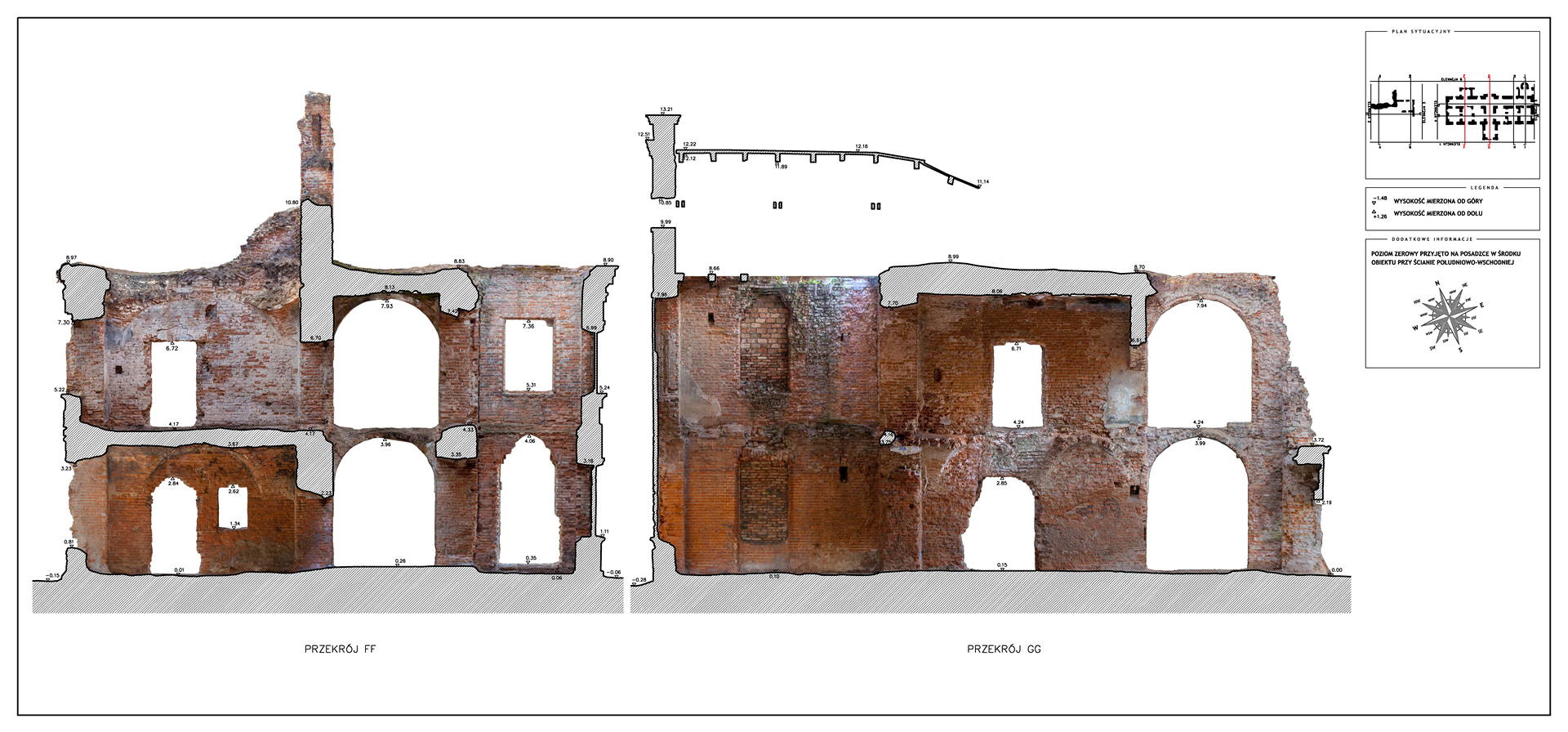 Located in South Eastern Poland in the town of Łaszczow, the current owner is planning to restore the ruins of this 16th Century Mansion House. Due to strict National Heritage regulations, the architect in charge commissioned an extensive survey to comprehensively record the remains of the existing structure. Orthoimages were produced to detail the position and condition of all the bricks within the remaining structure.