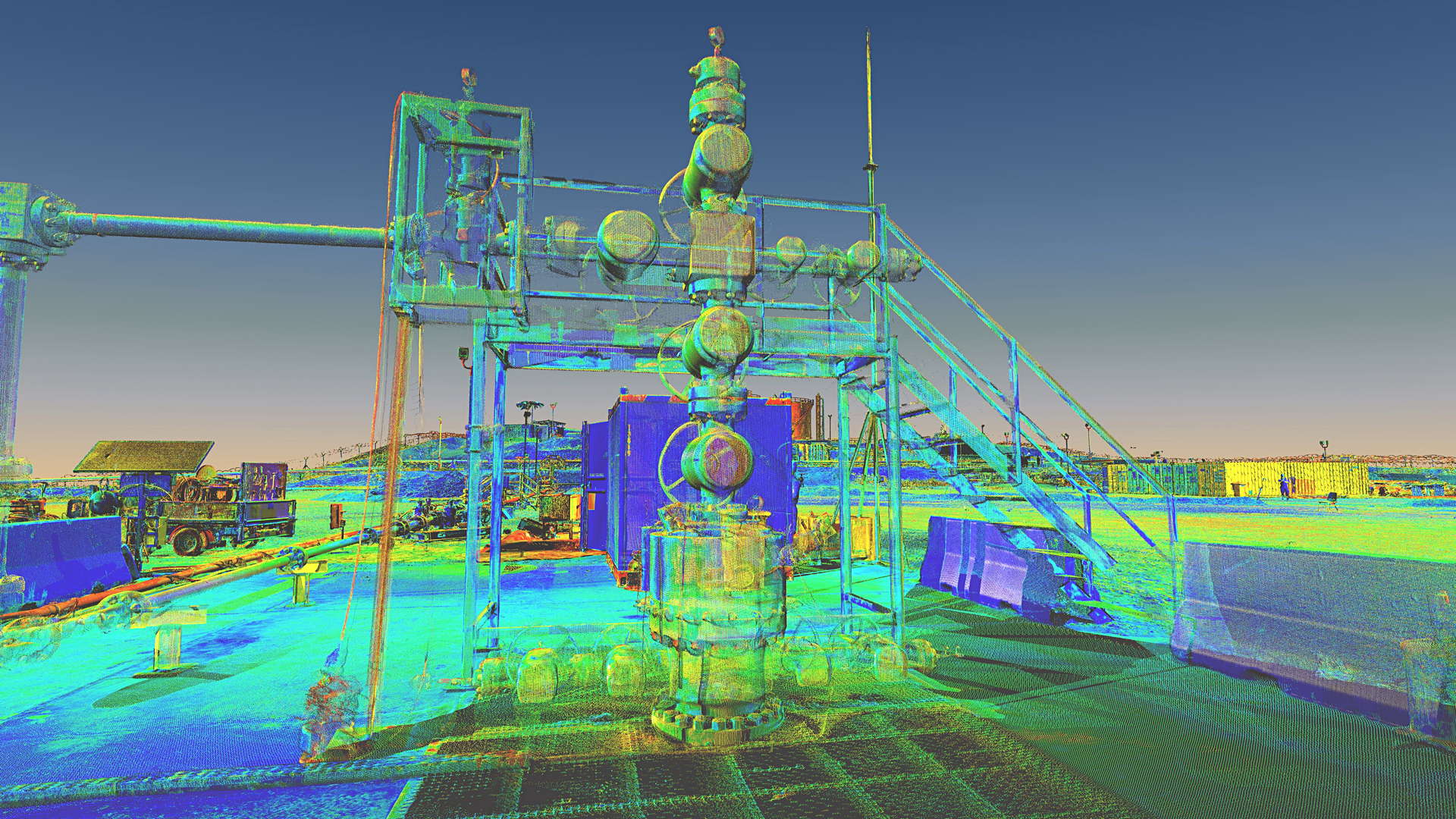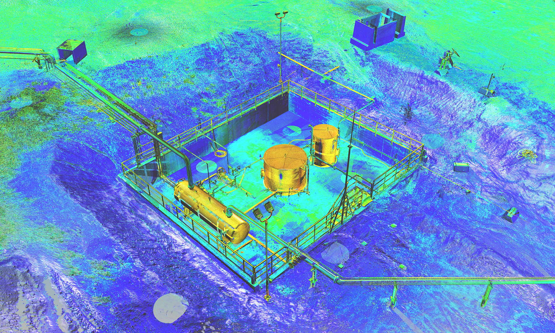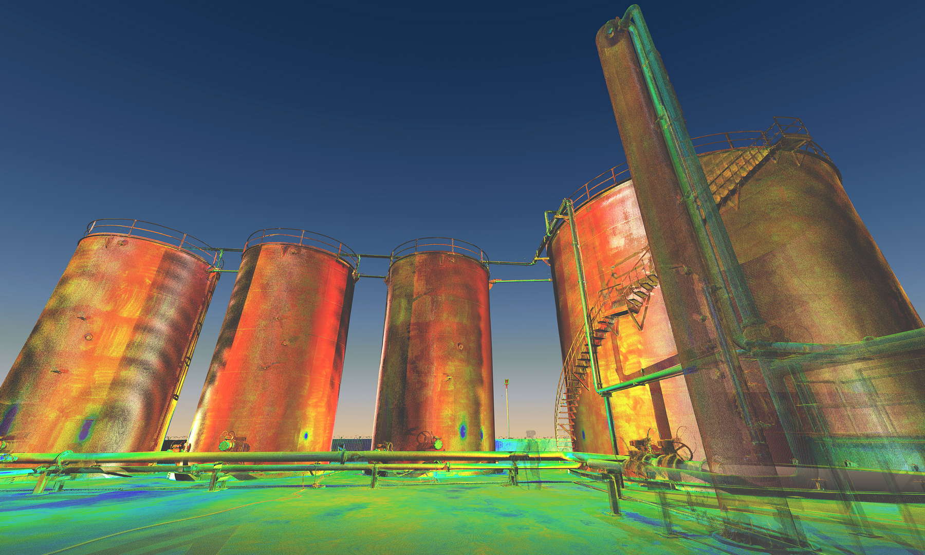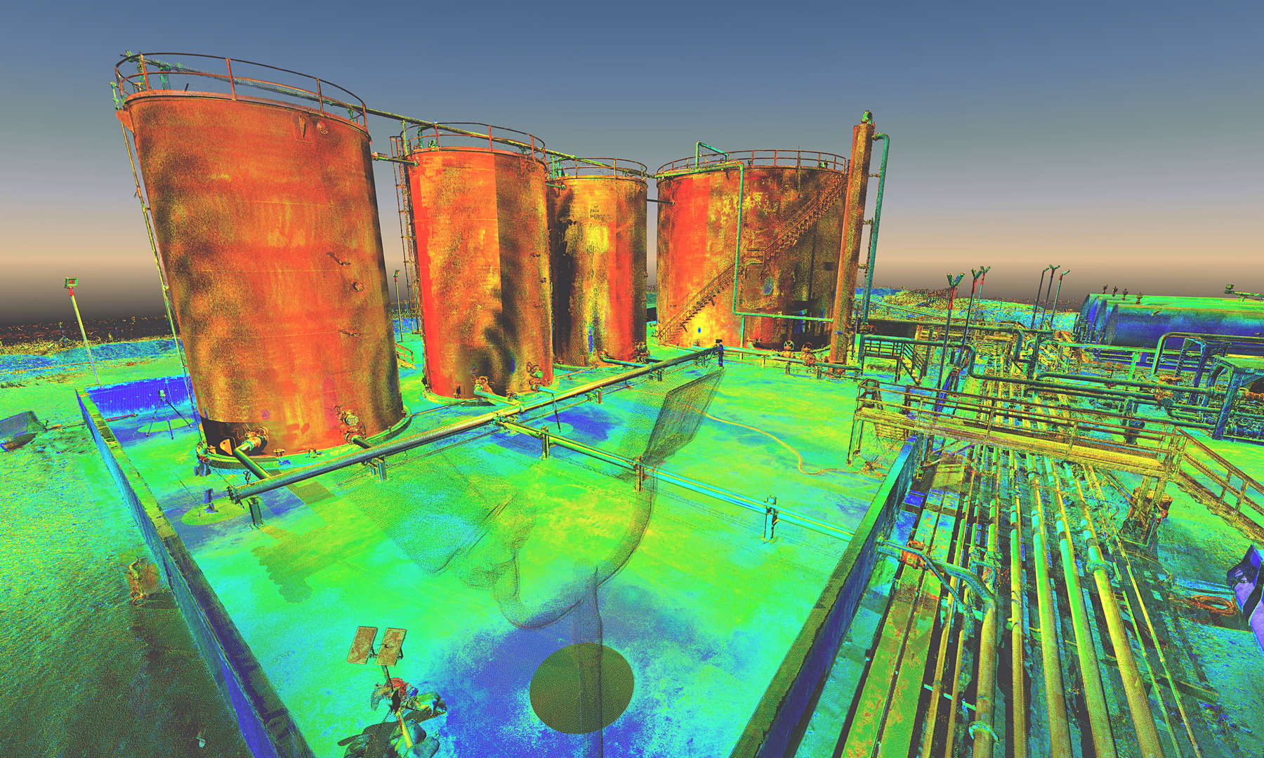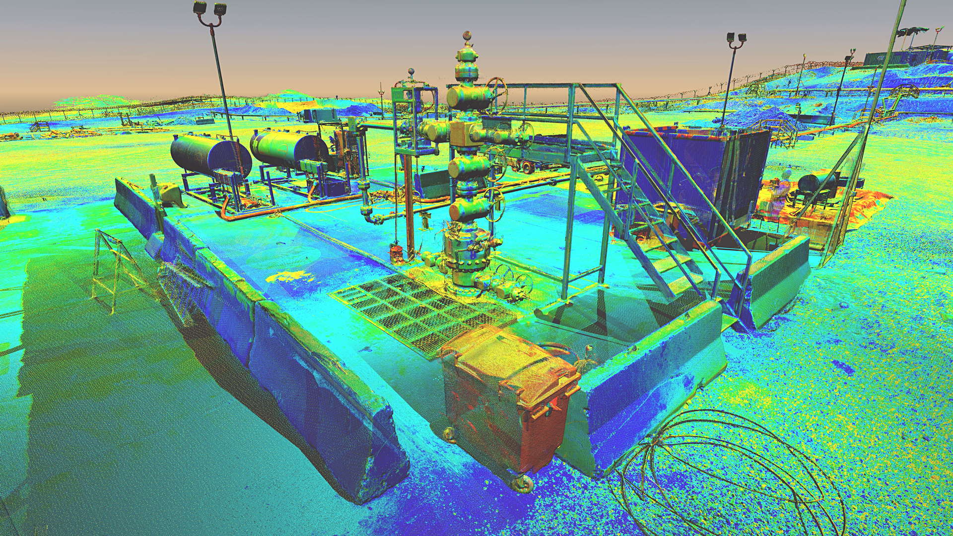The scope of works called for scanning a complete installation located on an oilfield in Kurdistan, northern Iraq. In addition to the wellhead we also scanned the pre-filtration, storage and transportation systems. The installation also contained a flare which constantly burns the natural gas filtered from the oil.