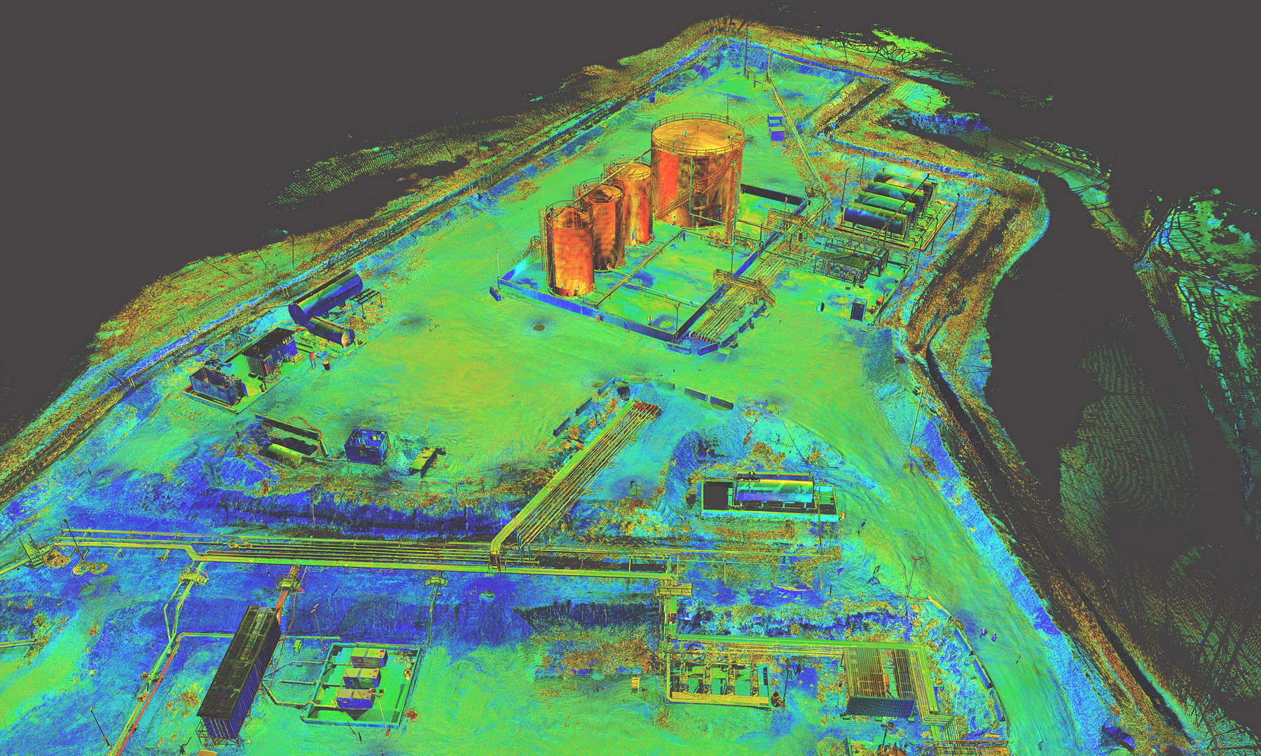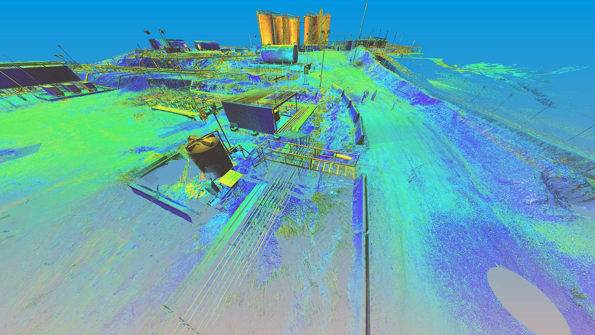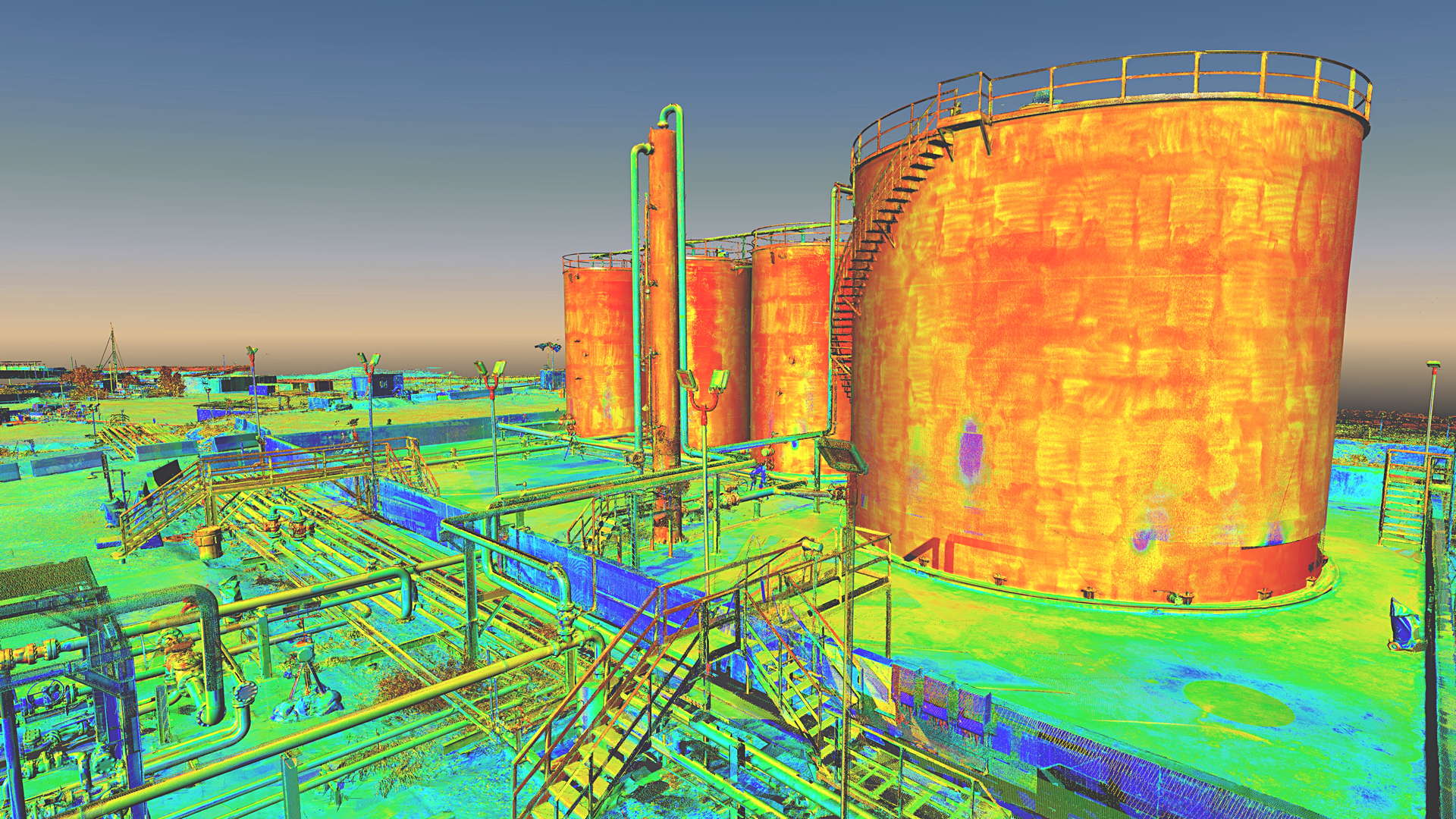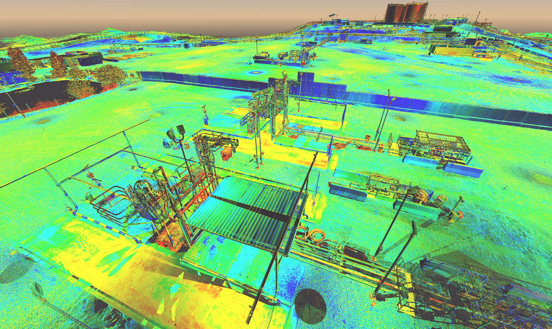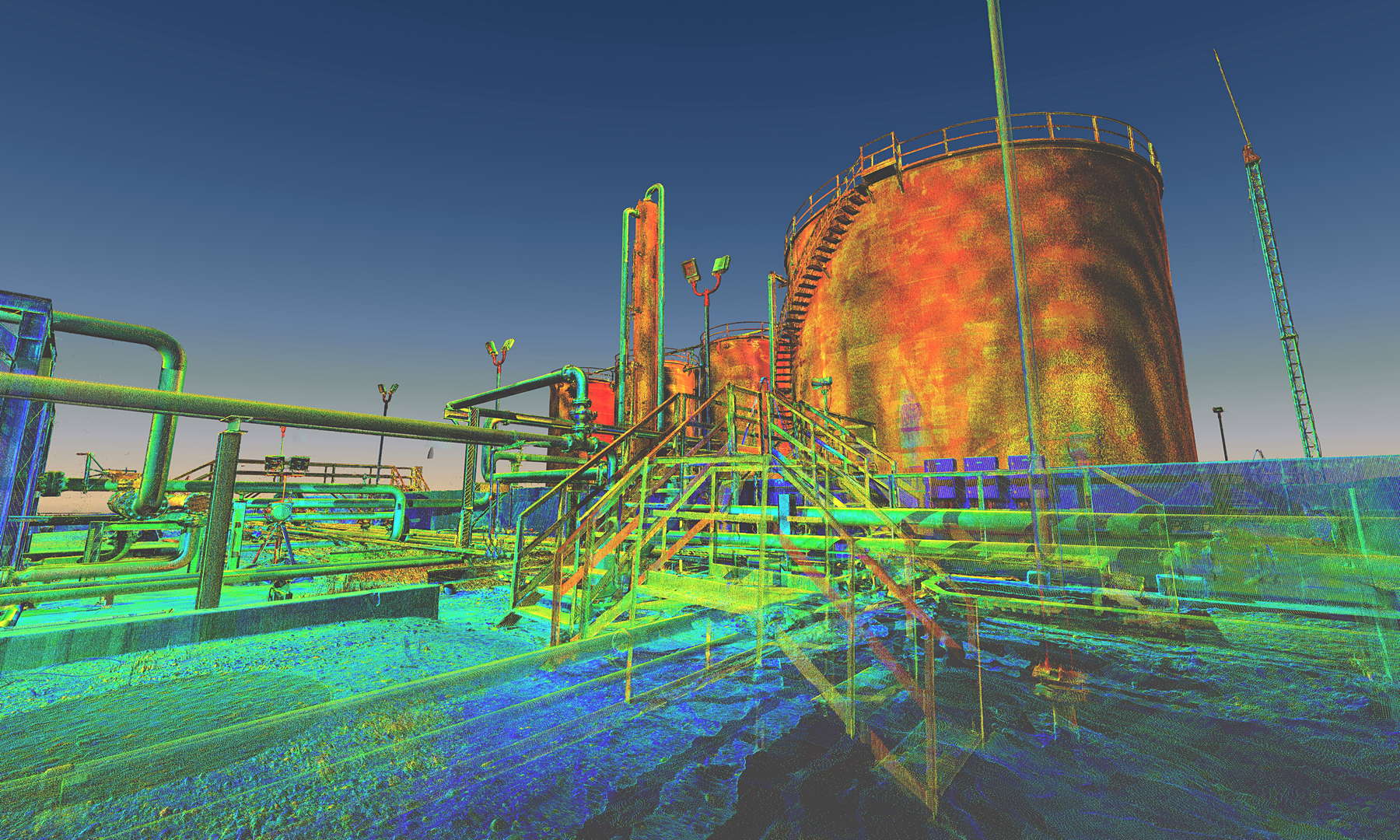 The scope of works called for scanning a complete installation located on an oilfield in Kurdistan, northern Iraq. In addition to the wellhead we also scanned the pre-filtration, storage and transportation systems. The installation also contained a flare which constantly burns the natural gas filtered from the oil.