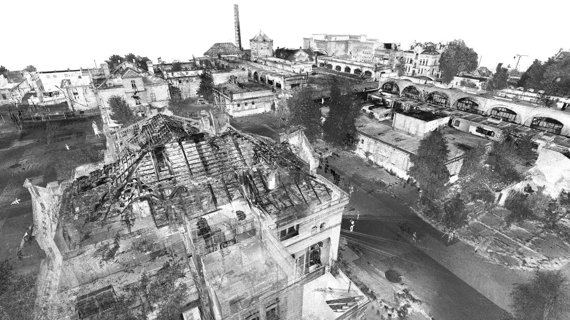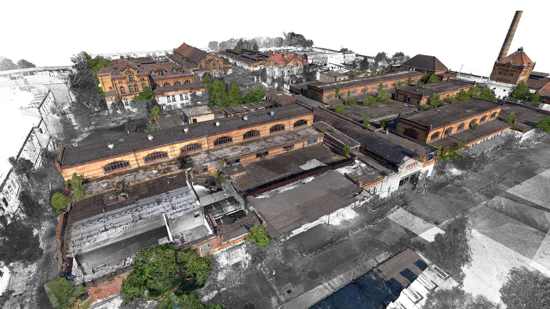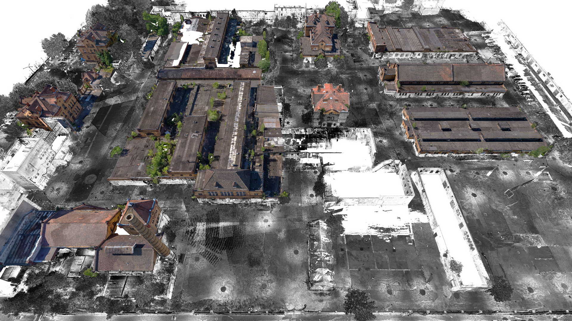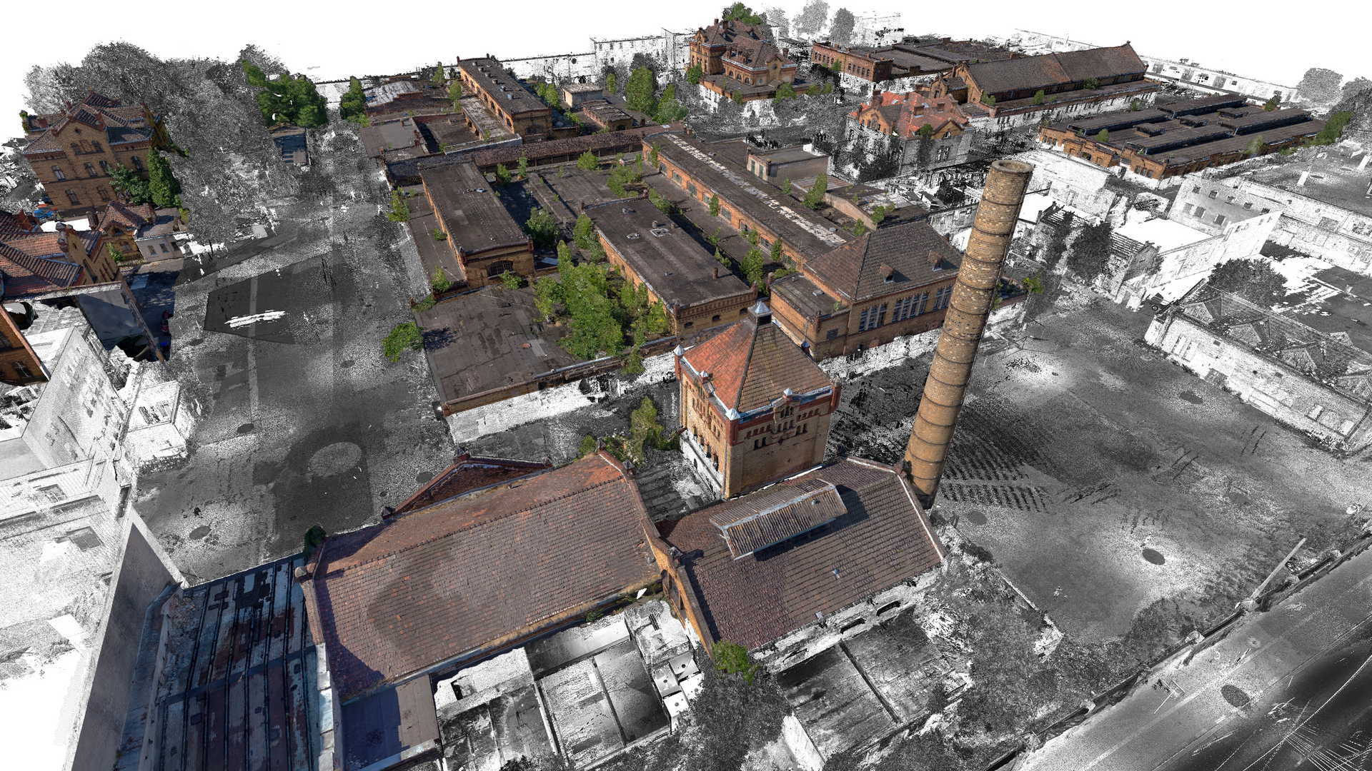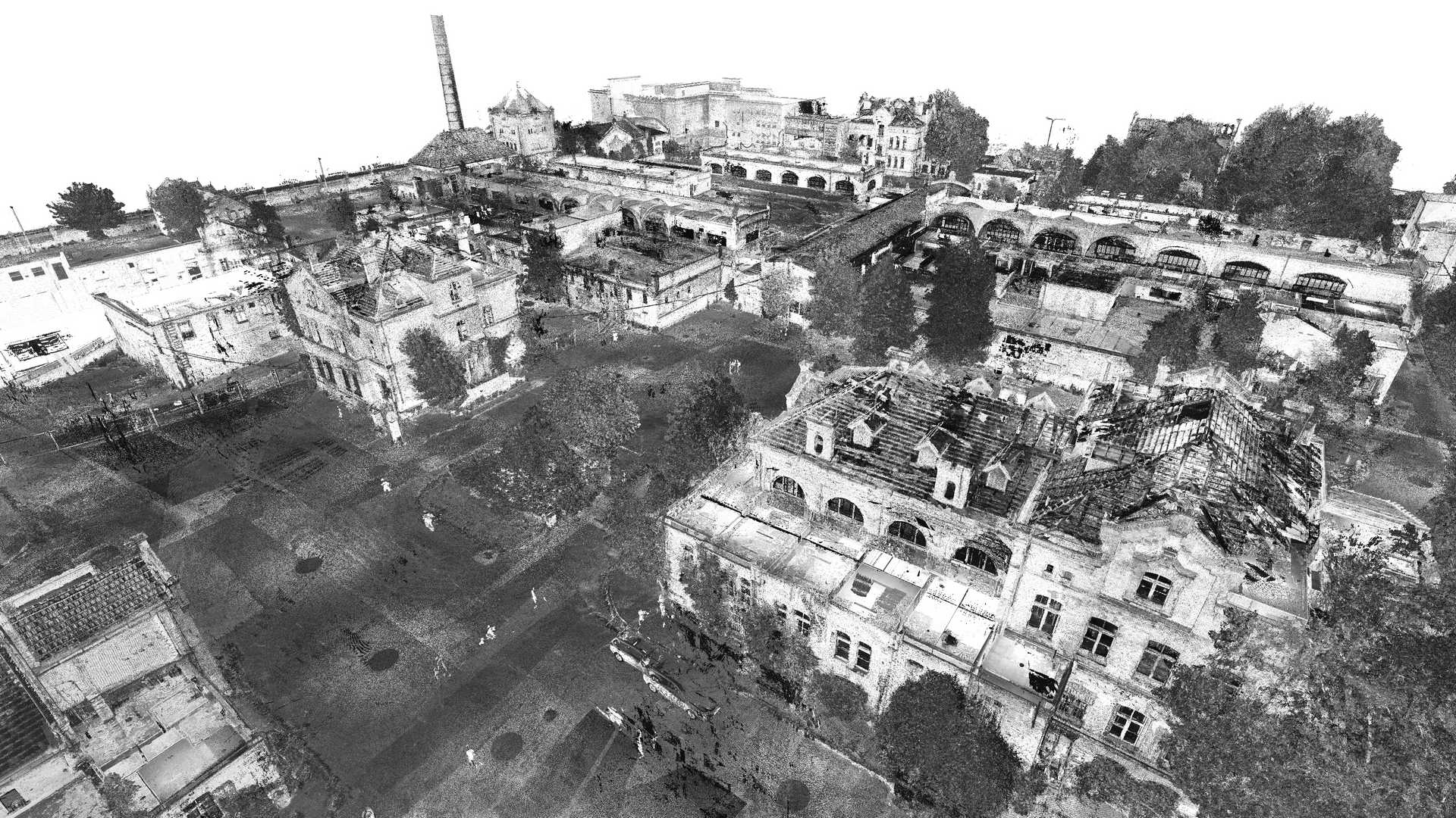 Measurements included traditional geodetic surveying with total station and GPS as well as a laser scanner. Data from laser scanner was complemented by a colourful point cloud obtained from UAV drone. It was decided to use as many non-invasive methods of data acquisition as possible because some buildings were in danger of collapsing or access to them was completely impossible.
