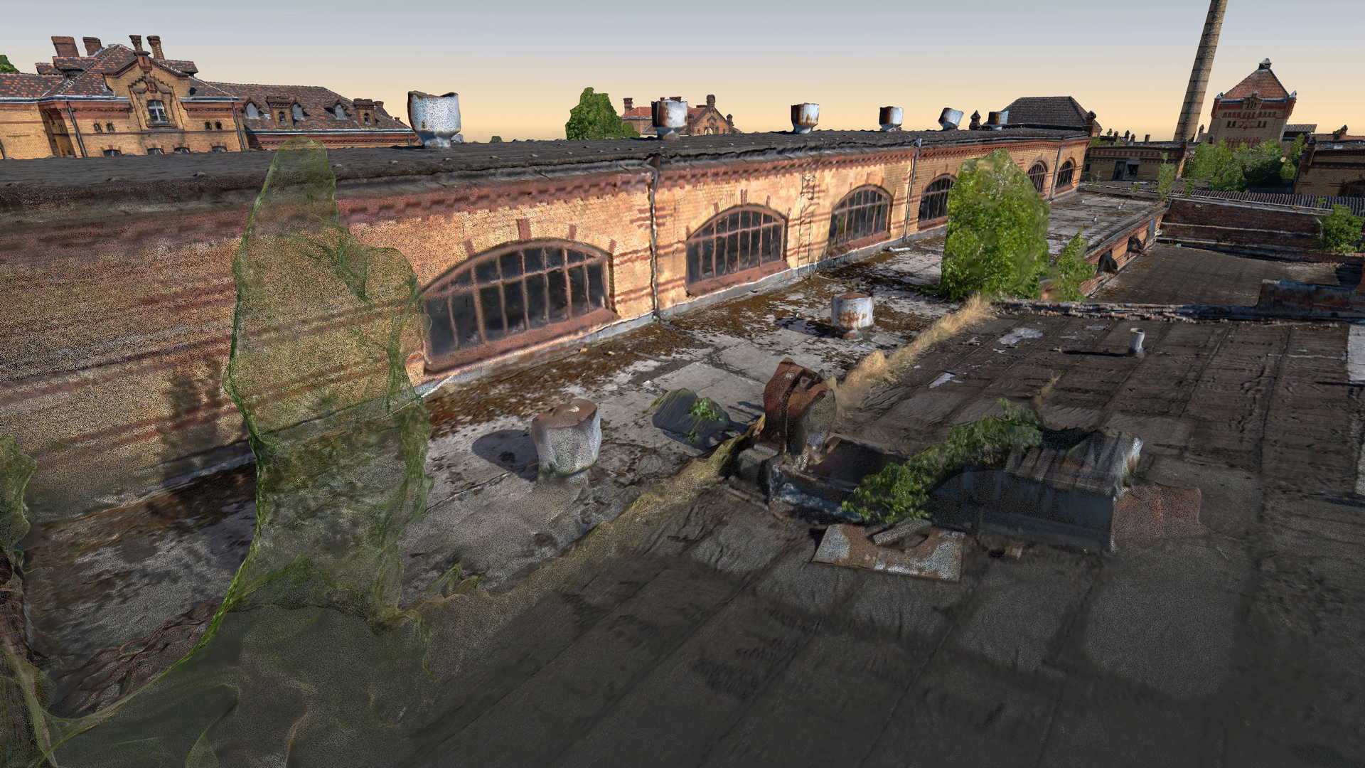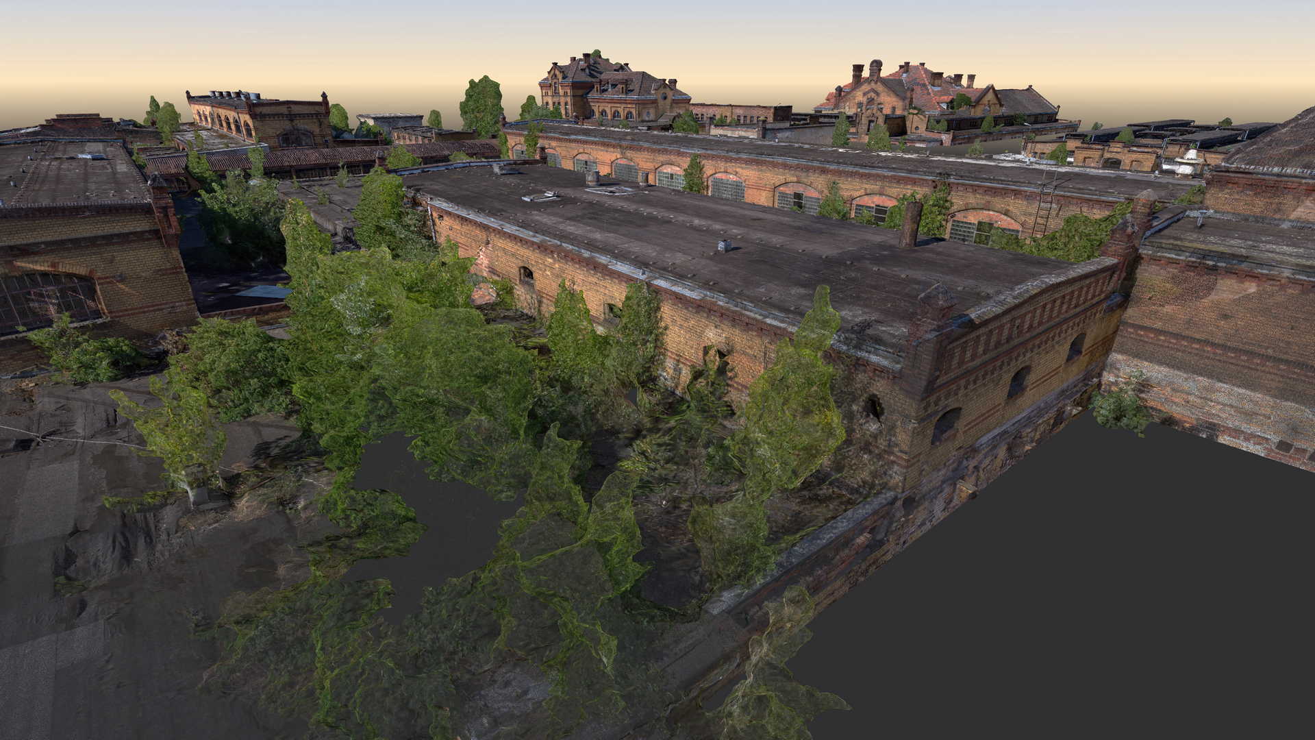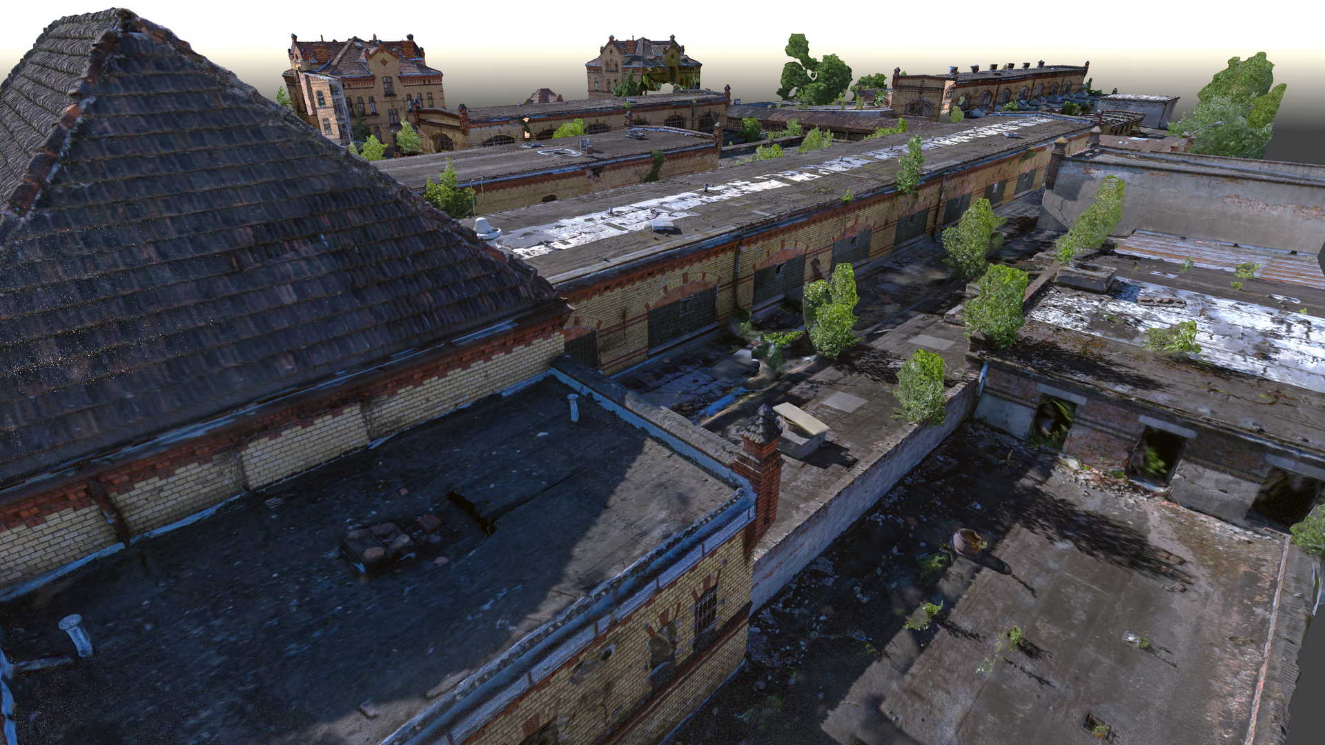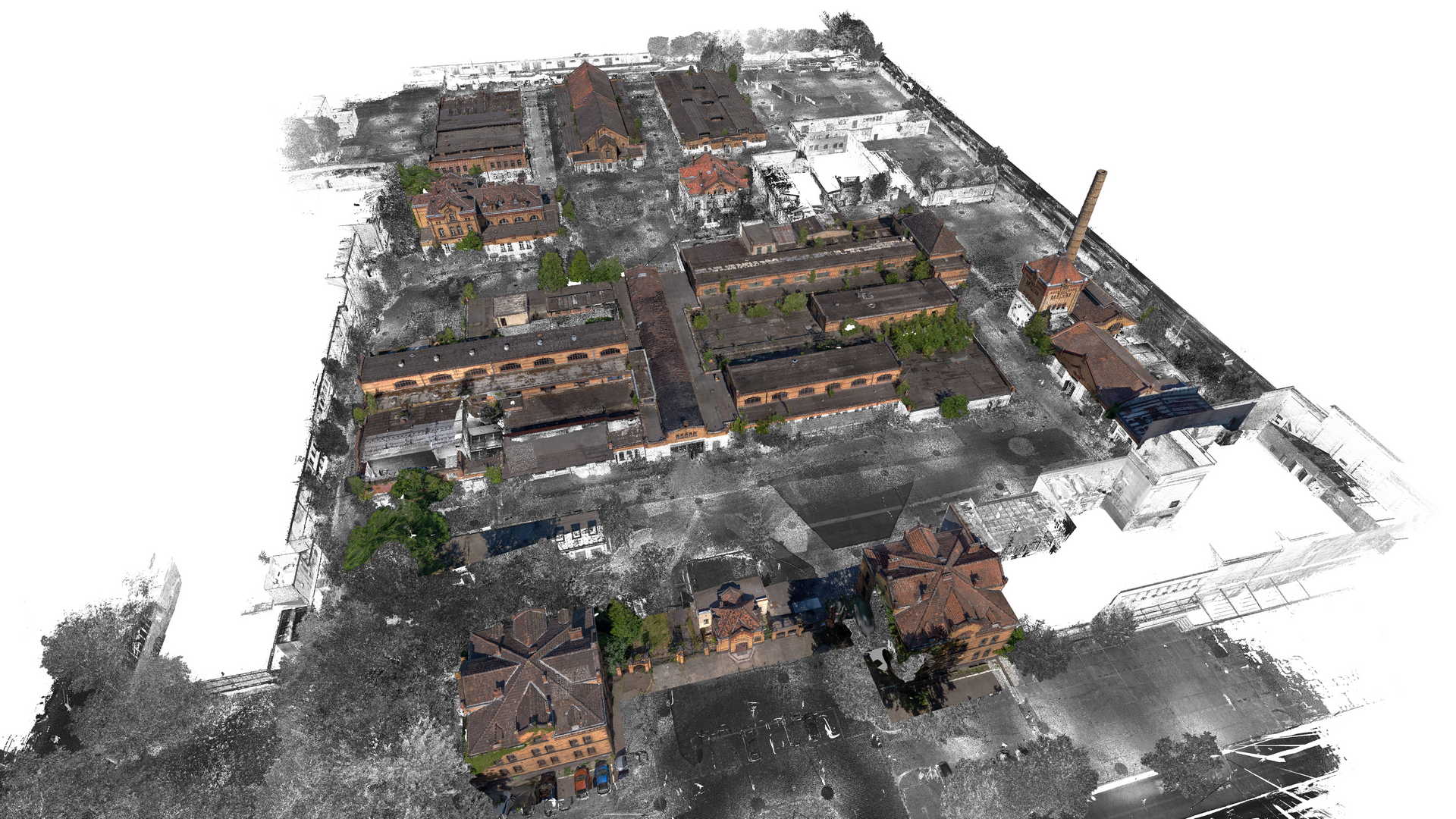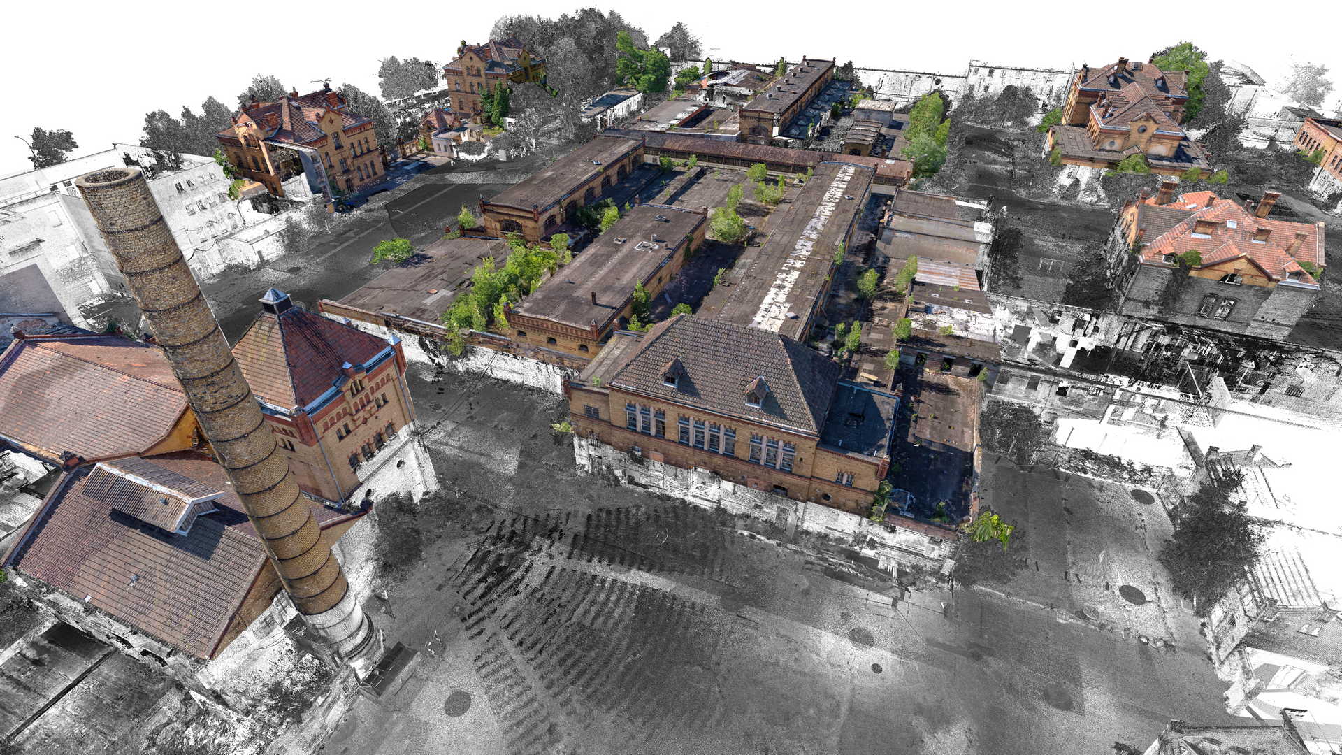 Measurements included traditional geodetic surveying with total station and GPS as well as a laser scanner. Data from laser scanner was complemented by a colourful point cloud obtained from UAV drone. It was decided to use as many non-invasive methods of data acquisition as possible because some buildings were in danger of collapsing or access to them was completely impossible.