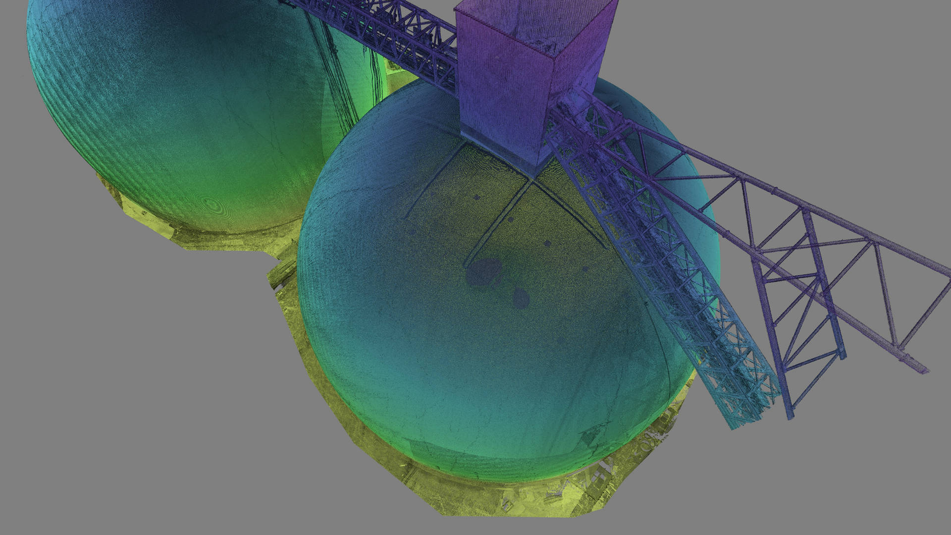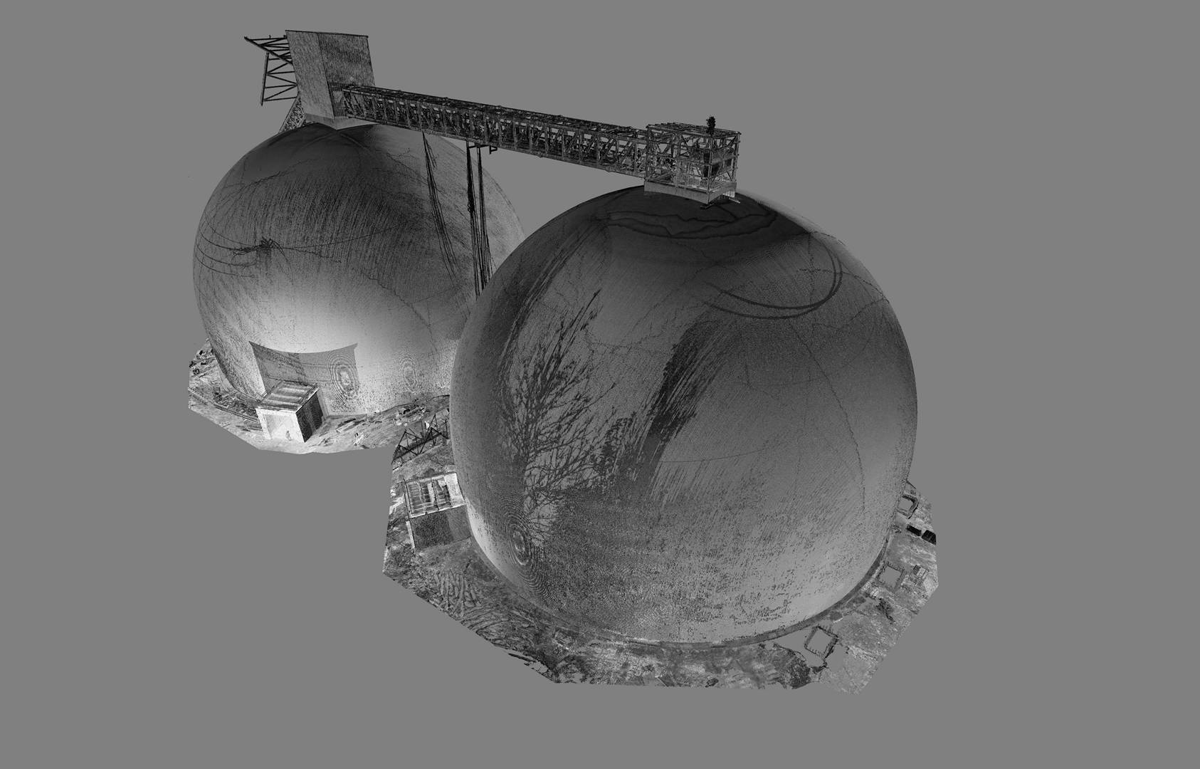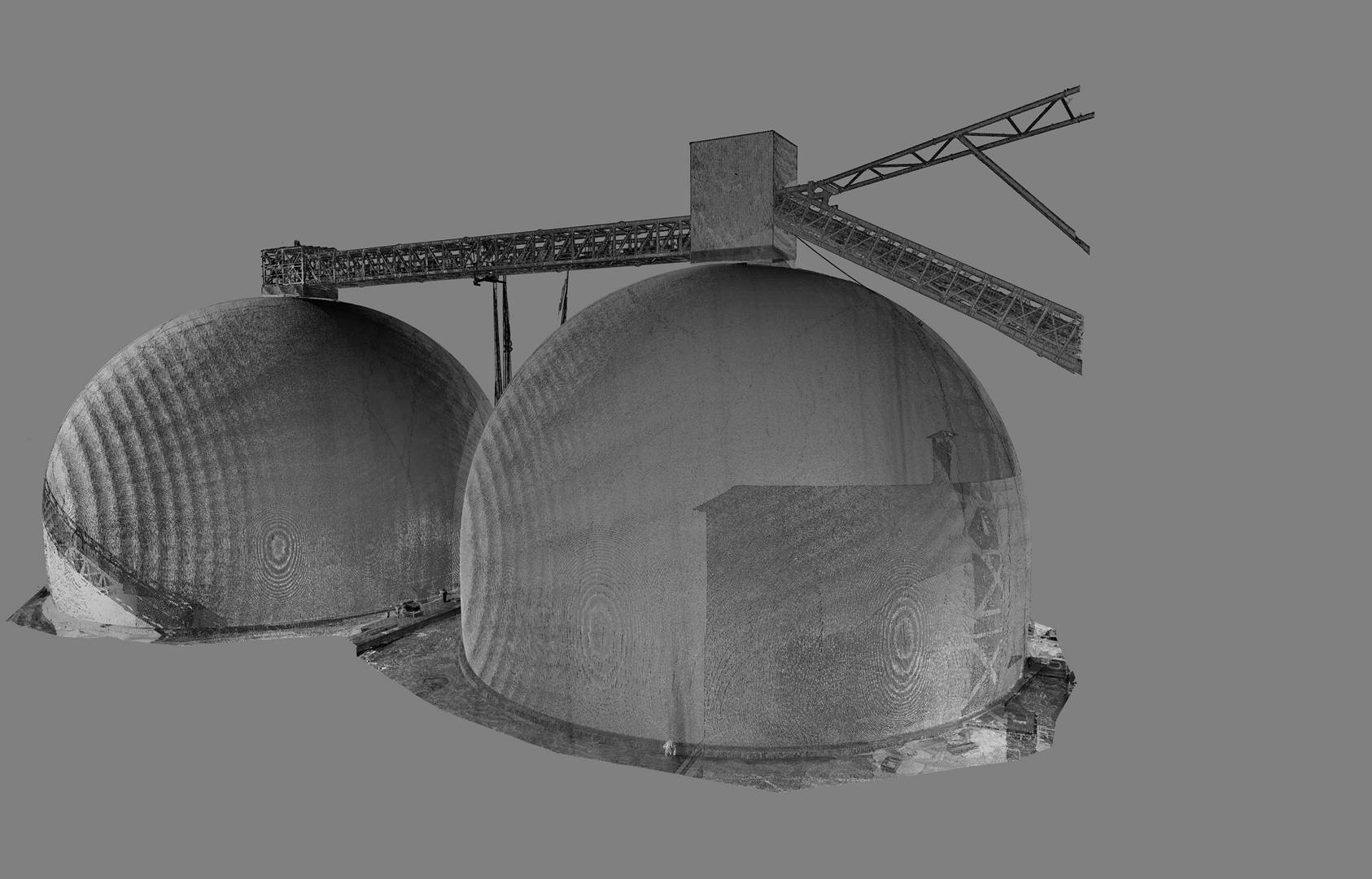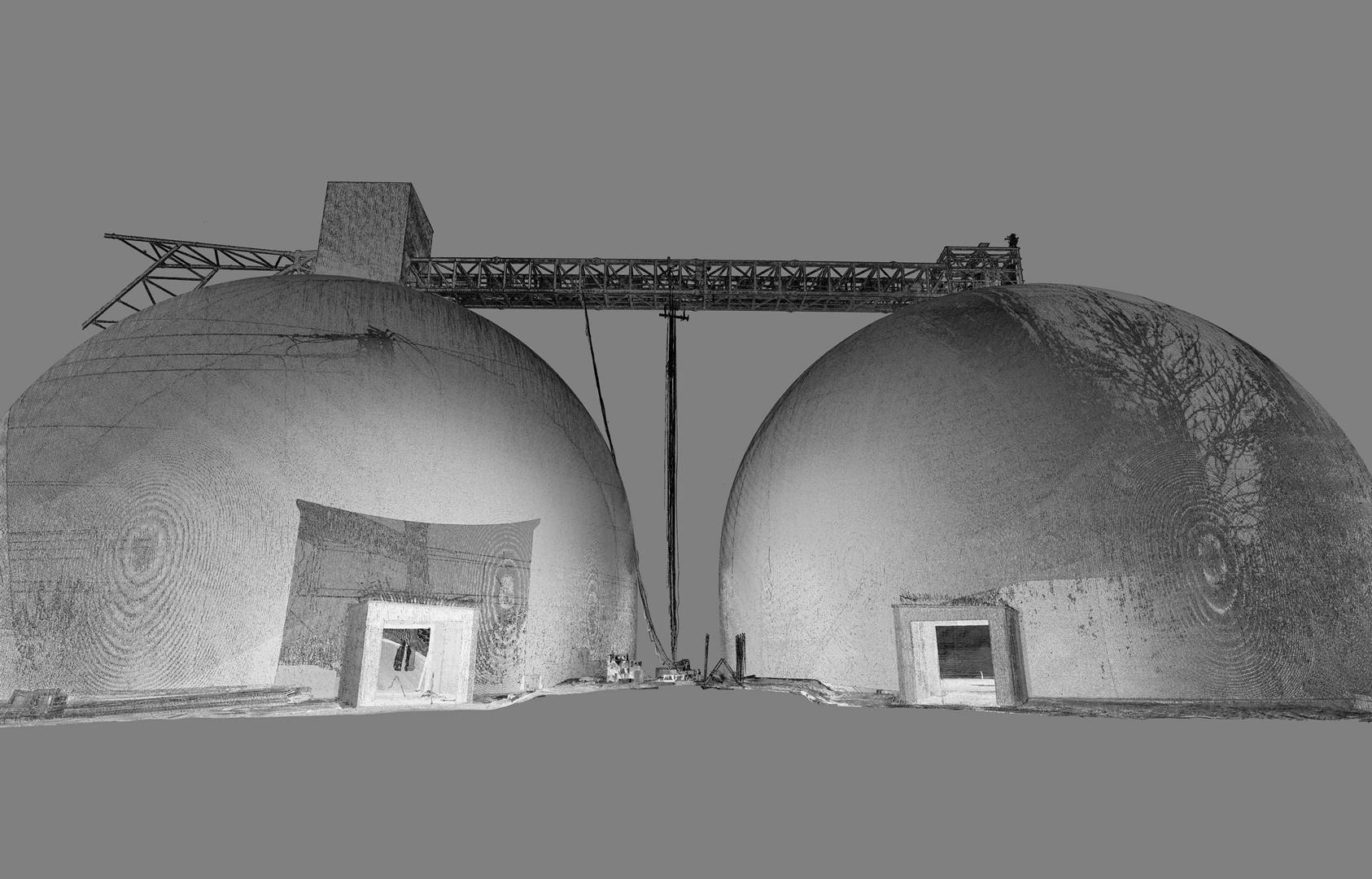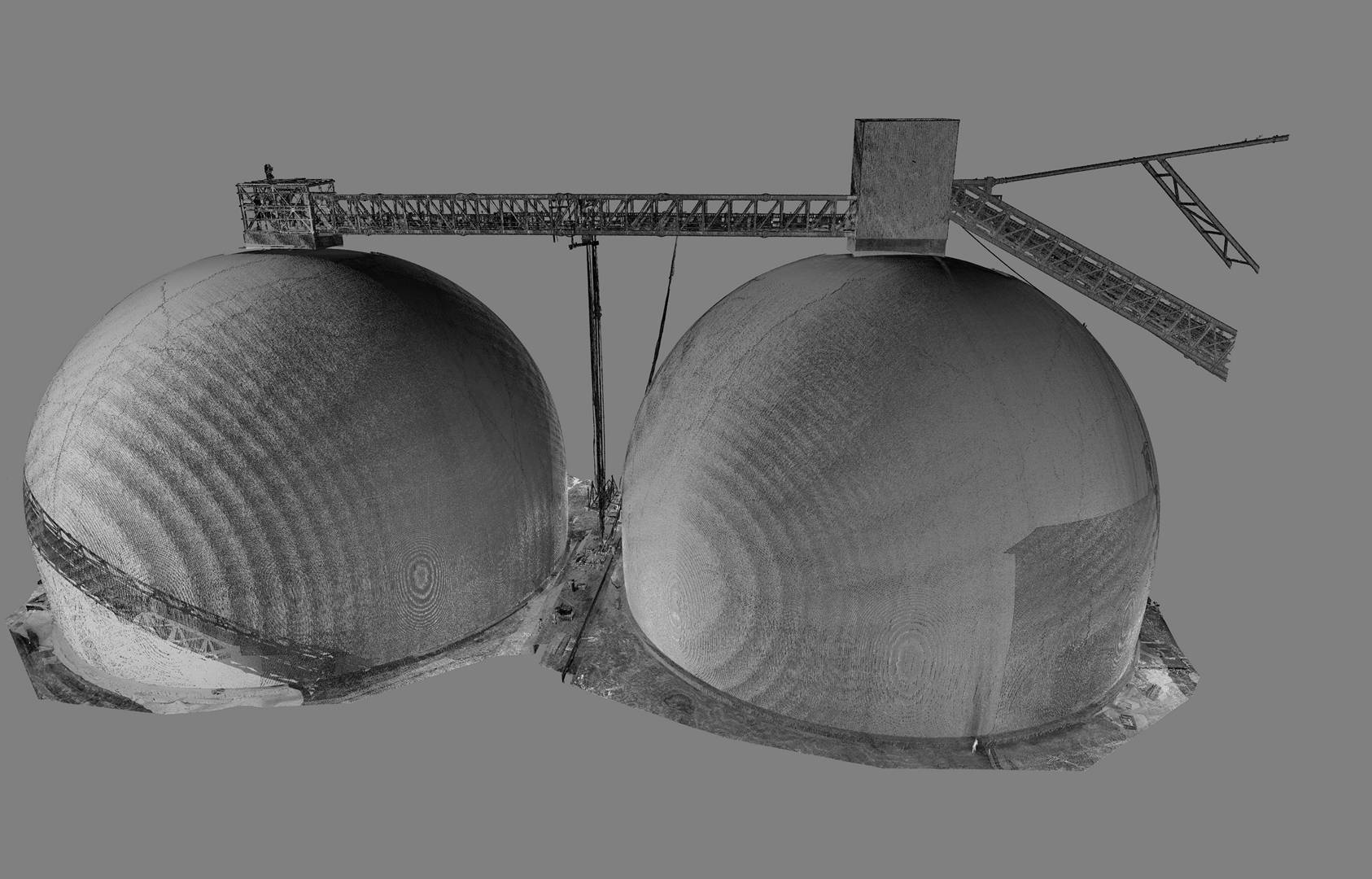 This cement plant in eastern Poland recently completed the construction of two silos with a capacity of 125,000 tonnes each. In order to verify the construction against the design 3Deling were commissioned to conduct an as-built survey. Particularly critical to the client was the determination of the thickness of the concrete shells, the accuracy of the survey information was therefore crucial.