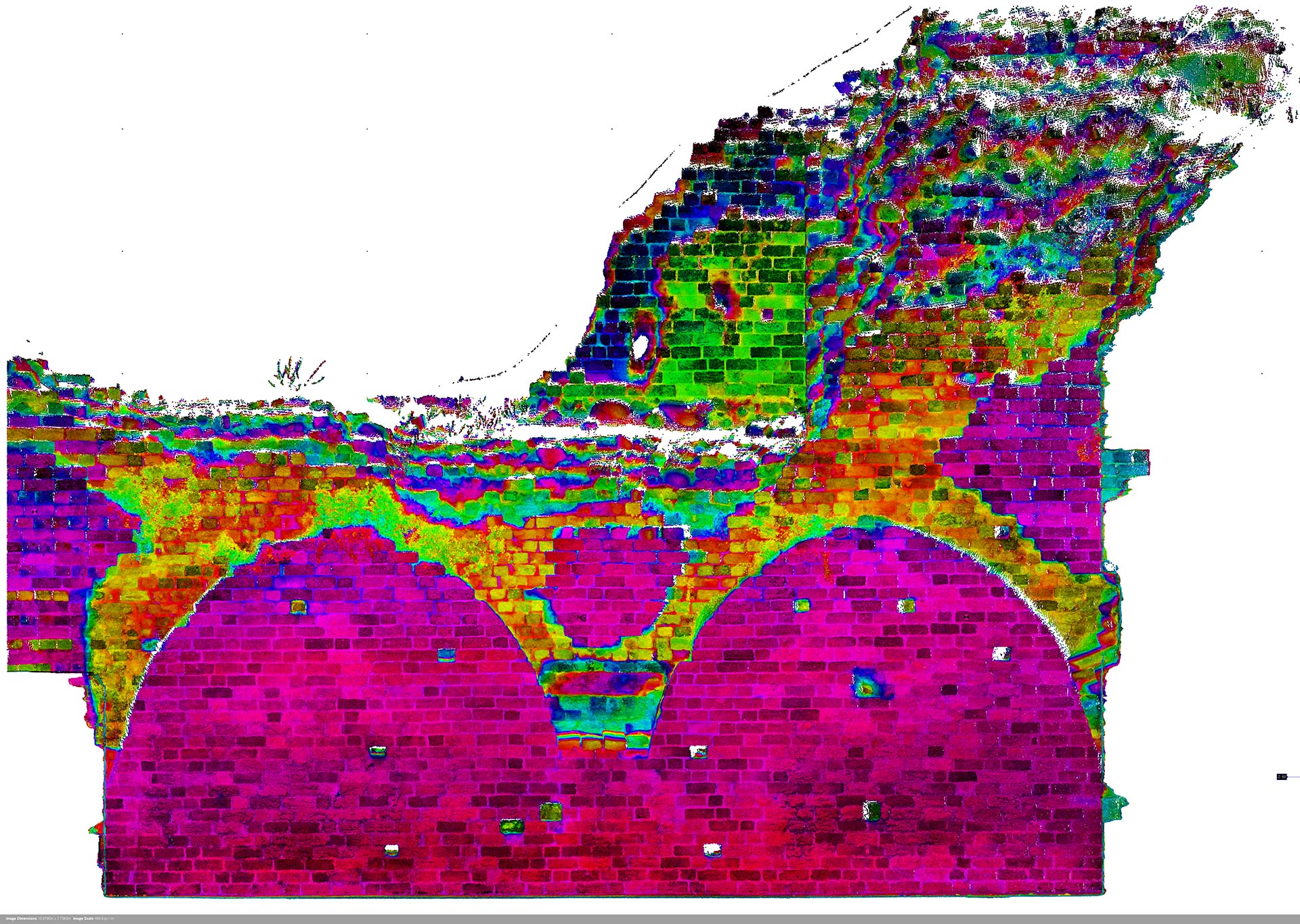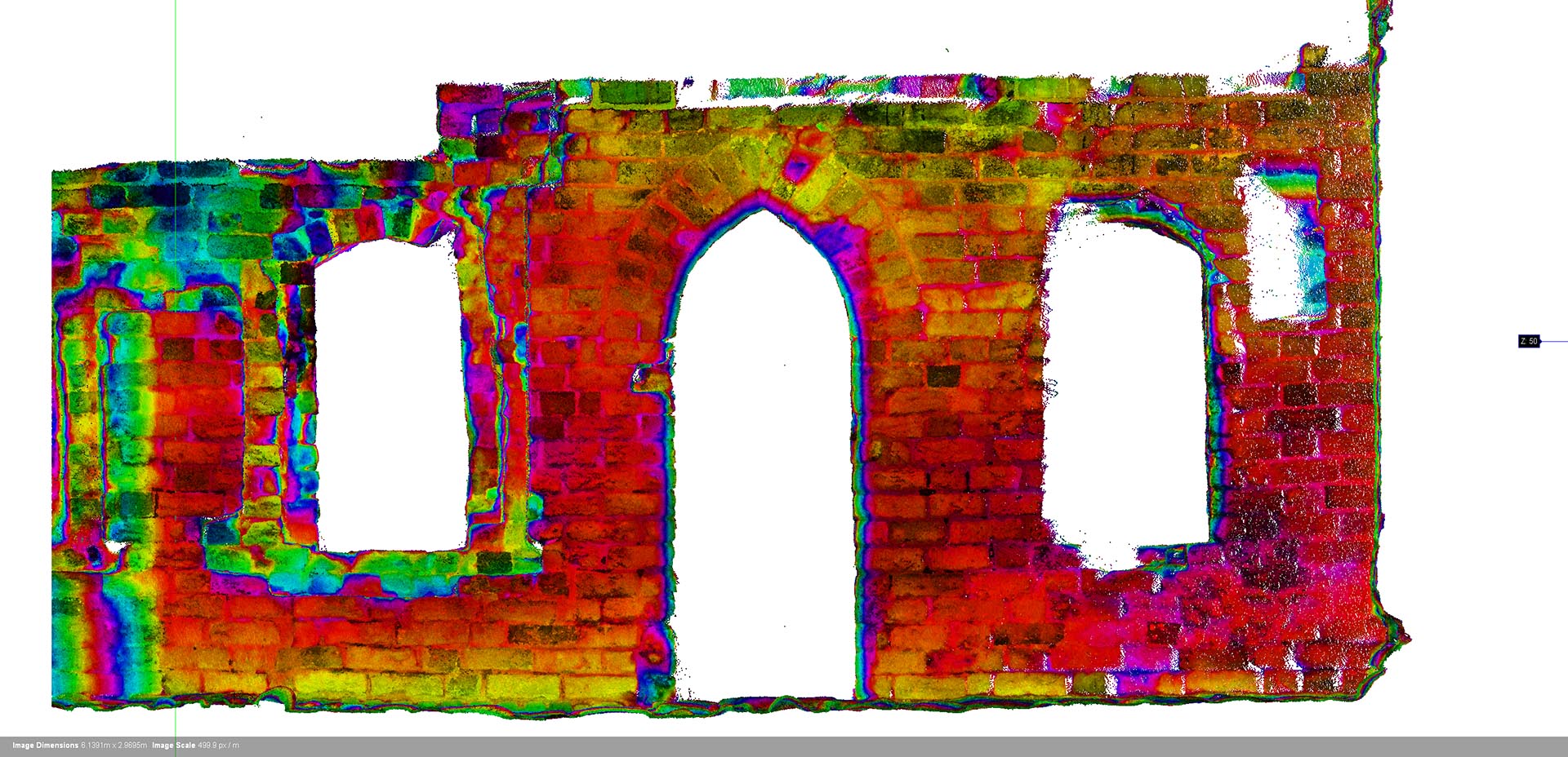 3Deling was commissioned to survey the 13th Century Teutonic Castle in Turon as a heritage record. In addition to scanning the building, which has largely been in ruins since 1454, the client commissioned metric images, orthophotos of individual segments of the walls in intensity colours from the point cloud.