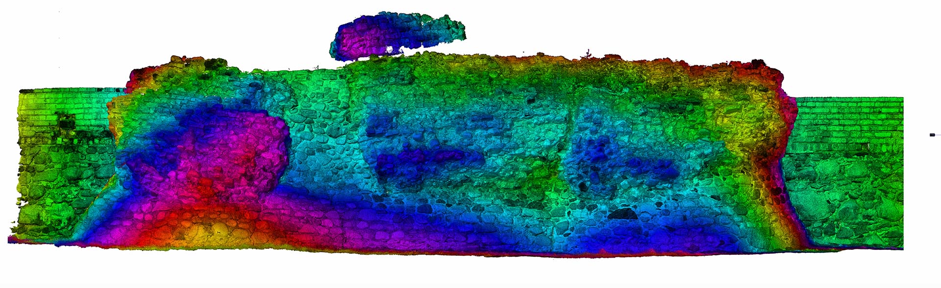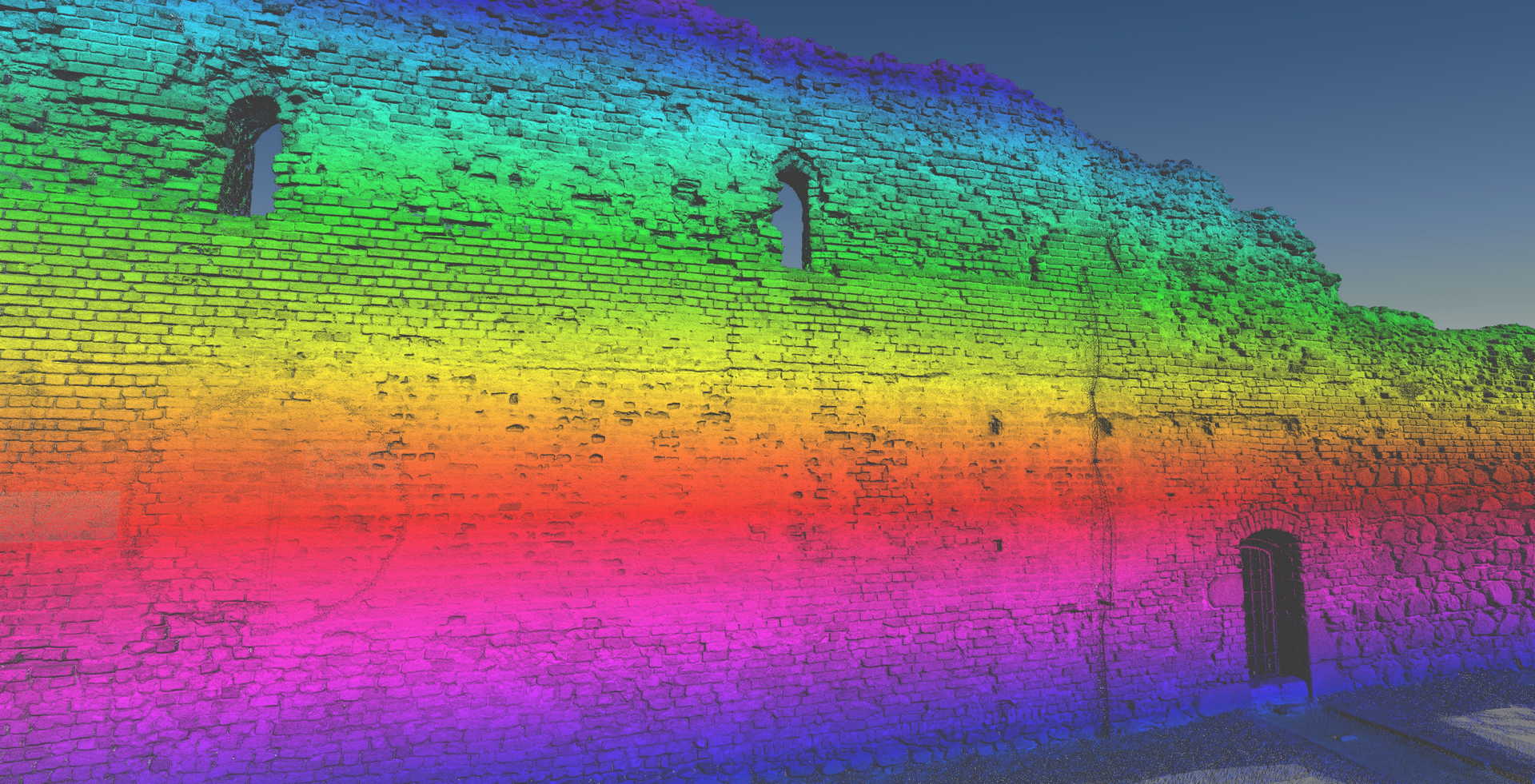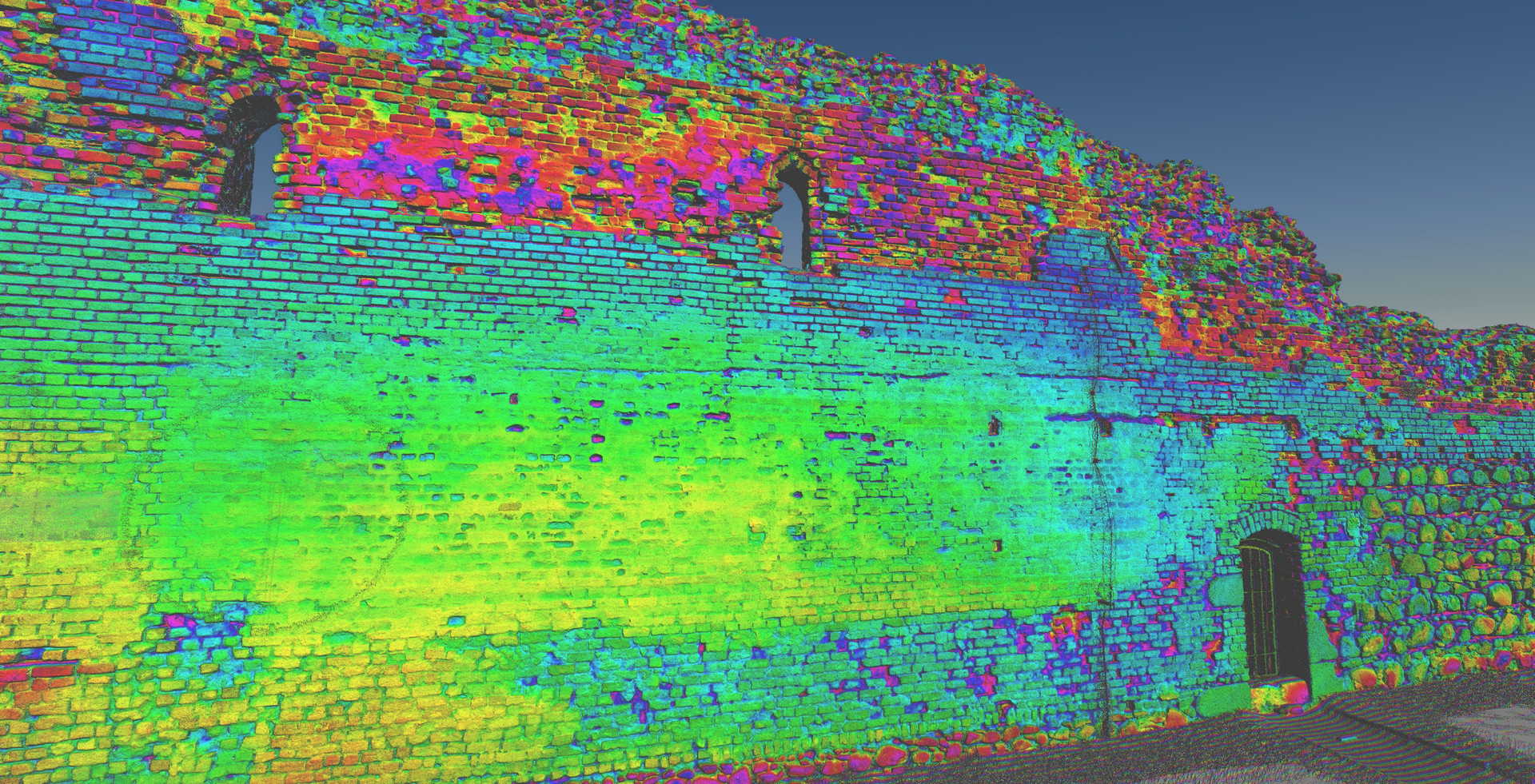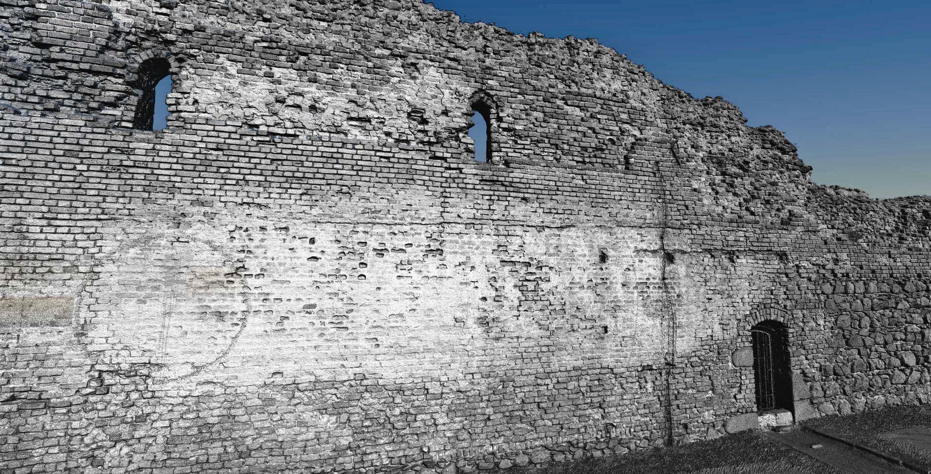2D elevations of the ruined walls were constructed from the dataset showing individual stones. Visualisations were also produced from the point cloud depicting the remains of the castle. The main wall from the side of the Vistula (The highest and most magnificent area) was additionally scanned in RGB colours.